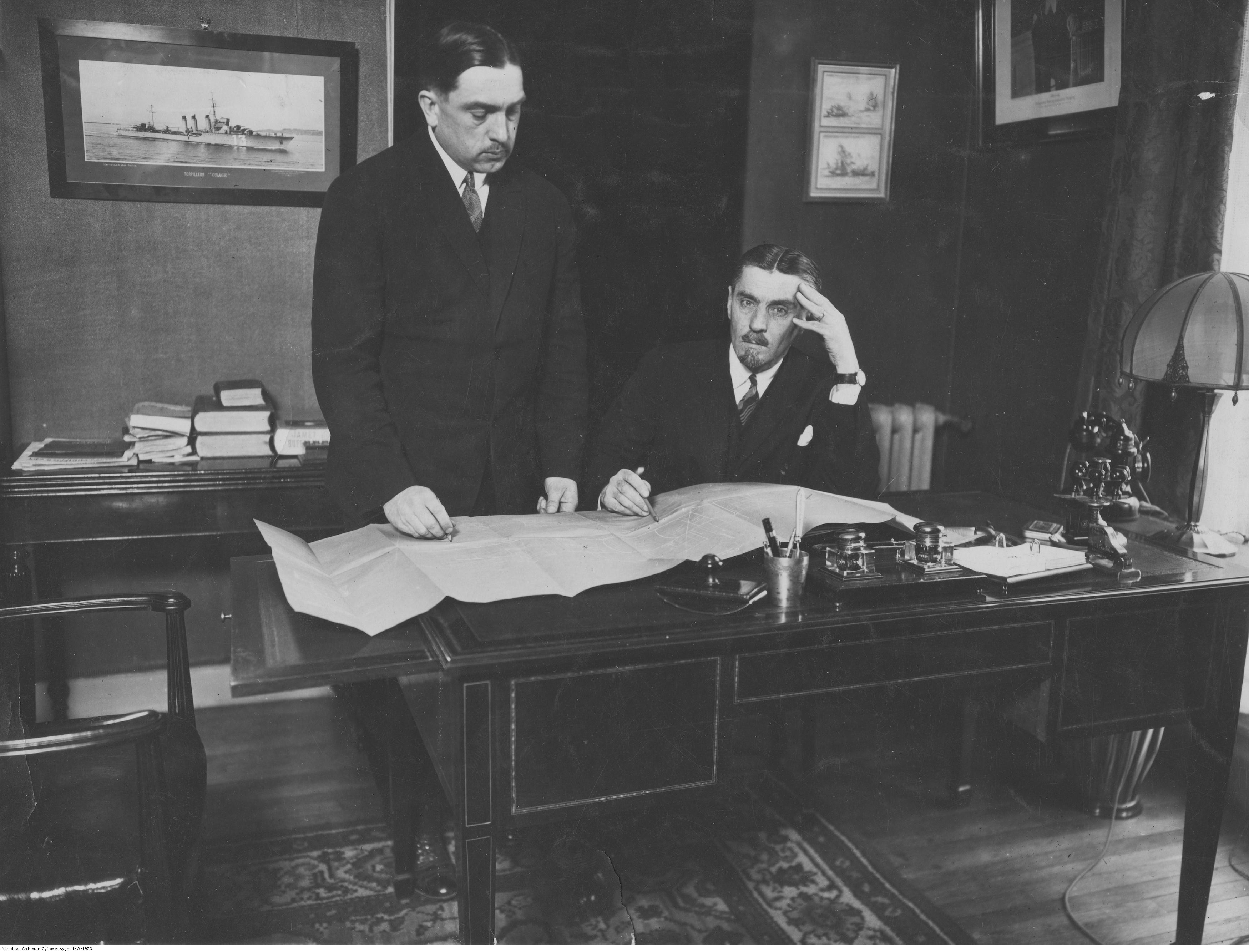 Przewodniczący Komisji Nadzorczej przy budowie okrętów Marynarki Wojennej inż. Ksawery Czernicki przy pracy w swoim biurze. Obok stoi zastępca przewodniczącego ppłk inż. Stanisław Rymszewicz.