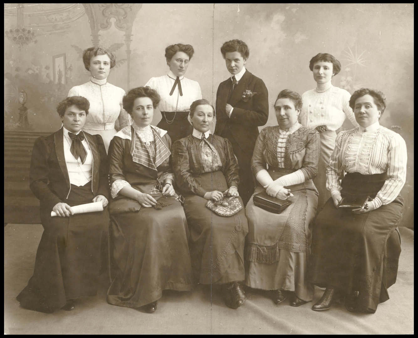 Stoją od lewej: skarbniczka Eugenia Waśniewska, sekretarka Wanda Stokowska (póżniej Wiktorowa Lampe), Wanda Herse, Zofia Tabęcka. Siedzą od lewej: wiceprzewodnicząca Justyna Budzińska-Tylicka, sekretarka Helena Zaborowska, przewodnicząca Zofia Stankiewicz, skarbniczka Paulina Dicksteinowa, Maria Papieska.