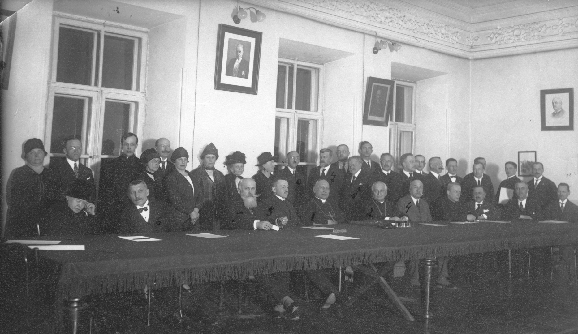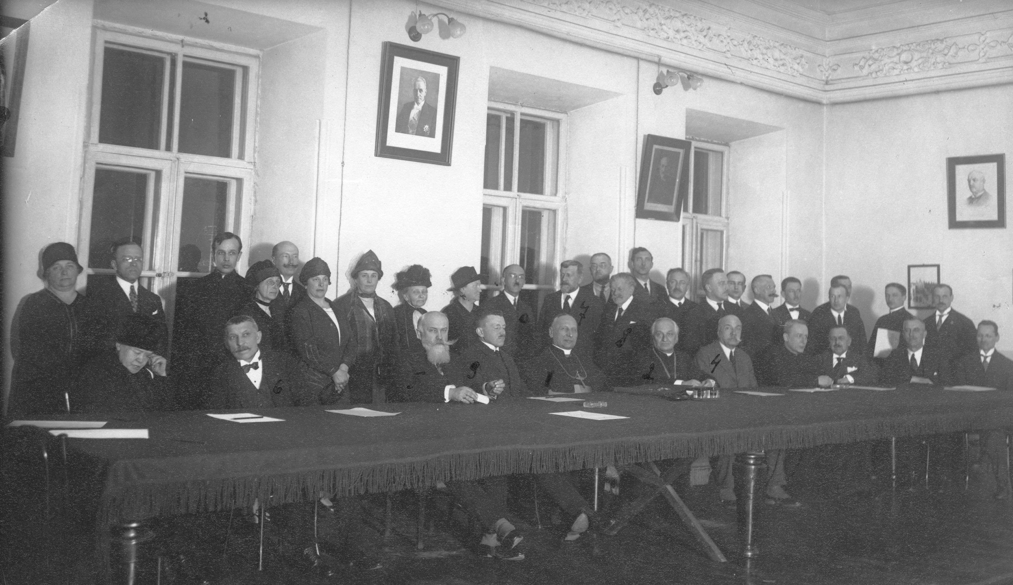 Członkowie komitetu. Widoczni m.in.: sufragan wileński ks. biskup Kazimierz Michalkiewicz (1), ks. biskup Władysław Bandurski (2), wicewojewoda wileński Olgierd Malinowski (3), przedstawiciel ziemiaństwa Z. Giecewicz (4), delegat Prokuratorii Generalnej p. Kopeć (5), prezes Dyrekcji Poczt i Telegrafów J. Popowicz (6), prof. Ferdynand Ruszczyc (7), prezes Syndykatu Dziennikarzy Czesław Jankowski (8), kierownik urzędu konserwatorskiego Jerzy Remer (9).