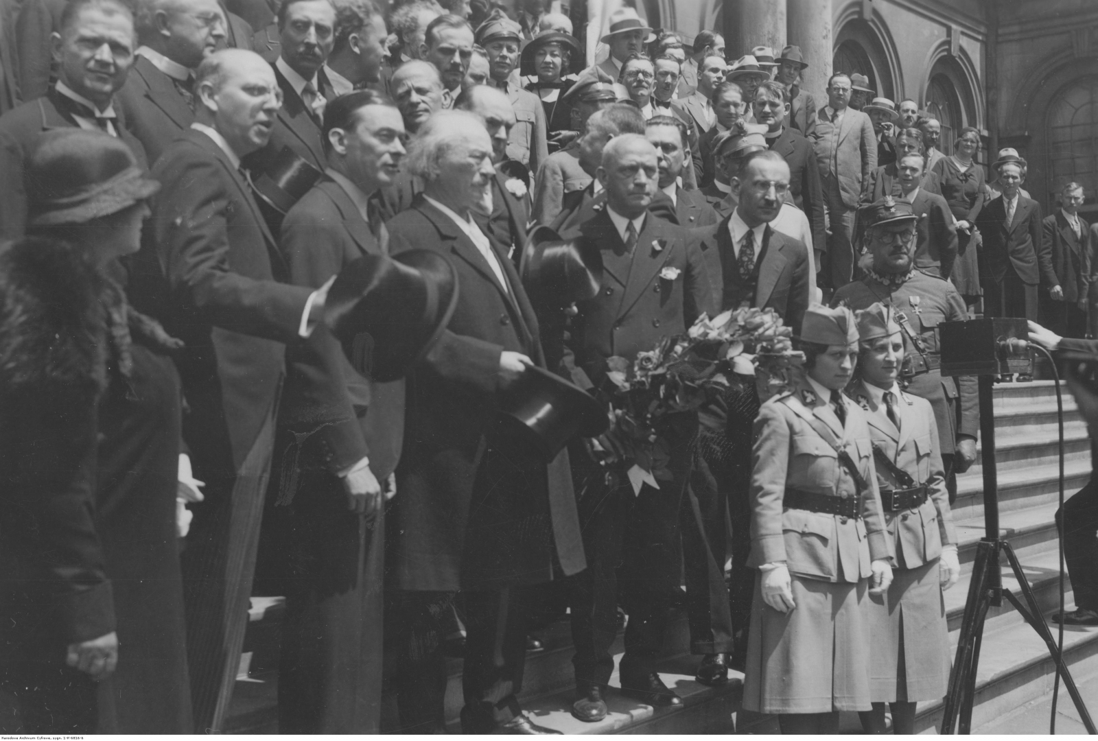 Pożegnanie kompozytora i pianisty Ignacego Jana Paderewskiego przed City Hall. Widoczni od lewej: sekretarz osobisty Ignacego Paderewskiego Sylwin Strakacz (stoi wyżej), delegat City Hall S. Mann, burmistrz Nowego Jorku James Walker, artysta Ignacy Jan Paderewski, dyrektor Biura Pracy w City Hall Edward Rybicki. Na pierwszym planie widoczne dziewczęta z polskiego oddziału amerykańskiego Stowarzyszenia Weteranów Wojennych.