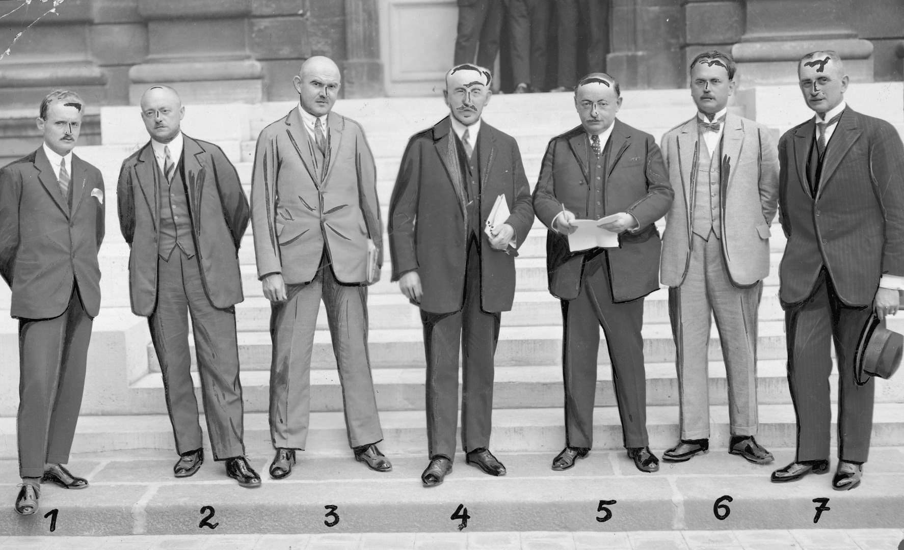 Delegaci polscy biorący udział w konferencji. Widoczni od lewej: delegat Wacław Czosnowski, poseł Władysław Kosydarski, poseł Jan Dębski, prof. Bronisław Dembiński, senator Stanisław Posner, poseł Konrad Ilski, senator Ludomir Puławski.