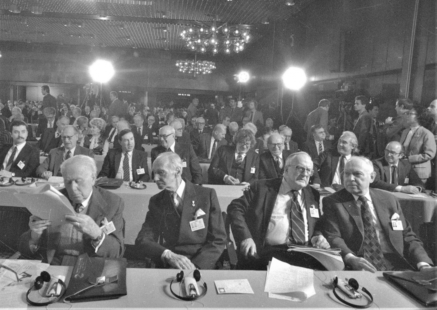 Fragment widowni sali obrad. Widoczni m.in., w pierwszym rzędzie od lewej: profesor Henryk Szletyński, prof. Kazimierz Wiłkomirski, przewodniczący Klubu Rzymskiego Alexander King i prof. Adam Schaff. W drugim rzędzie: pisarka mongolska i przewodnicząca mongolskiego Towarzystwa Pracowników Twórców Kultury Mongolii Erdene Byłyn Ojuun (1. z lewej), Stavros Panou (4. z lewej) i przewodniczący Bułgarskiego Komitetu Pokoju Georgi Dymitrow - Goszkin (4. z prawej).
