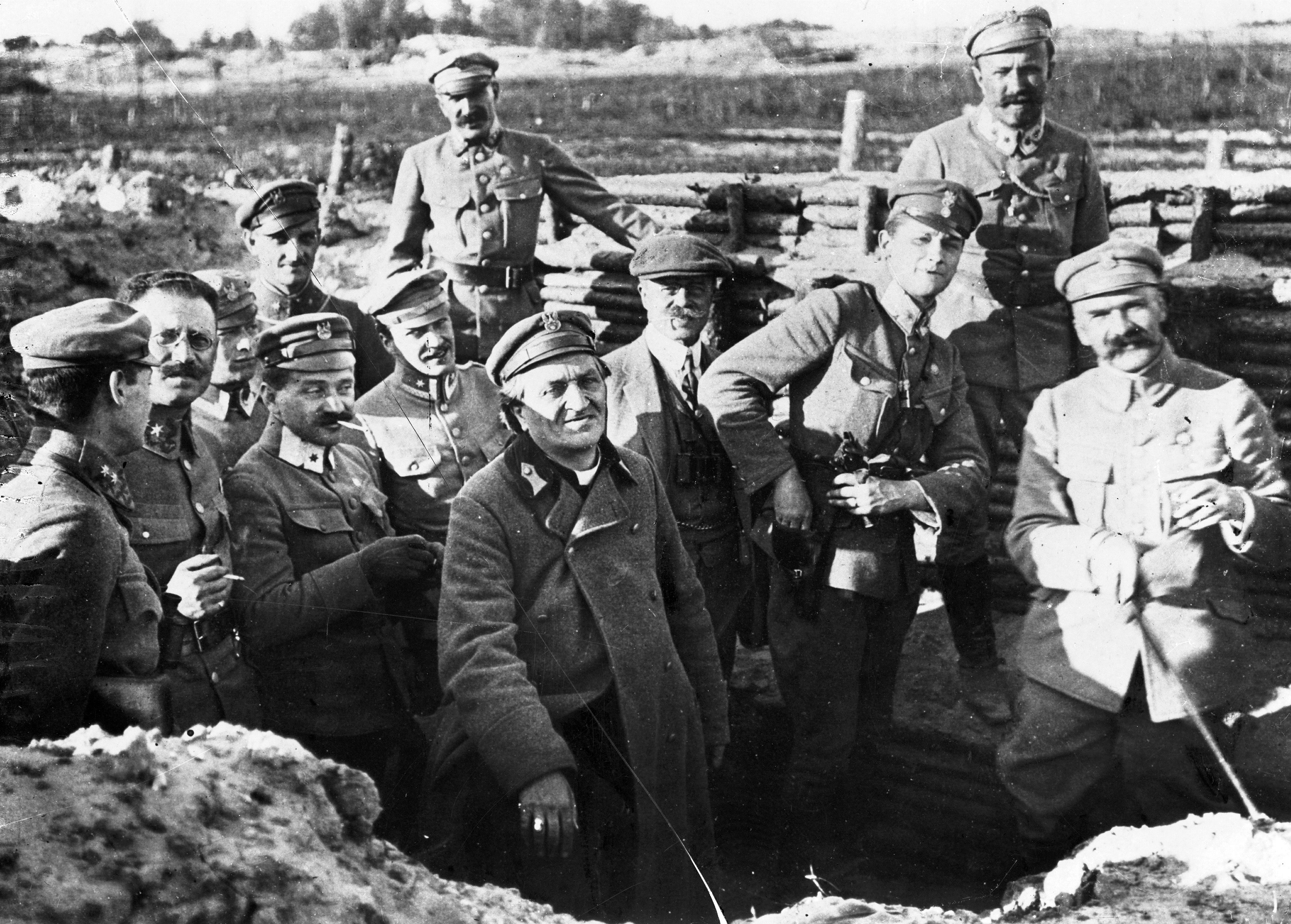 Biskup Władysław Bandurski (5. z prawej) w okopie. Widoczni również: Józef Piłsudski (1. z prawej), dowódca 5 pułku piechoty Legionów Polskich Leon Berbecki (2. z prawej), major Tadeusz Wyrwa-Furgalski (3. z prawej), książę Andrzej Lubomirski (w ubraniu cywilnym), pułkownik Zygmunt Zieliński (6. z prawej), podporucznik Morstin, lekarz major Kołłątaj, podporucznik Aleksander Łuczyński, lekarz podporucznik Mieczysław Kaplicki (4. z lewej - stoi w pierwszym rzędzie), porucznik Mirski-Przyjałkowski.