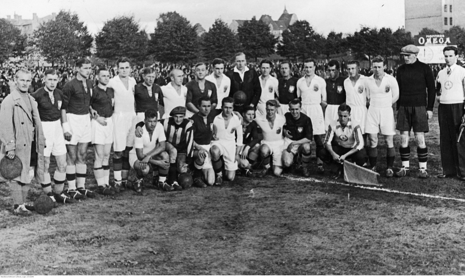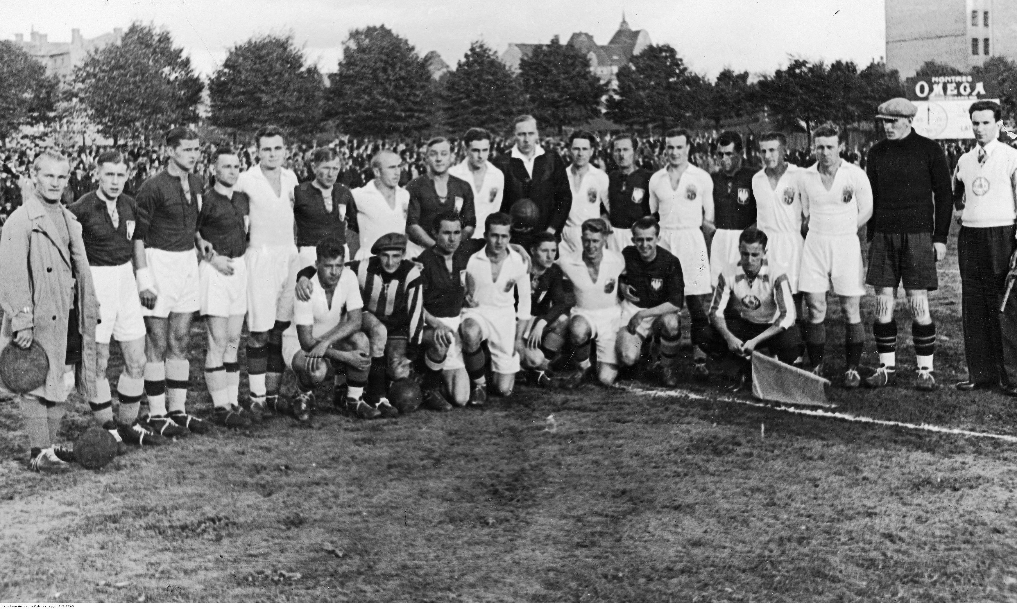 Drużyny reprezentacji Łotwy i Polski przed meczem. W ciemnych koszulkach od lewej stoją: Władysław Szczepaniak, Teodor Peterek, Antoni Gałecki, Władysław Karasiak, Karol Pazurek, sędzia Esko Pekkonen, Marian Schaller, Ryszard Łysakowski. Kleczą: Stefan Domański, Witold Wypijewski, Gerard Wodarz.