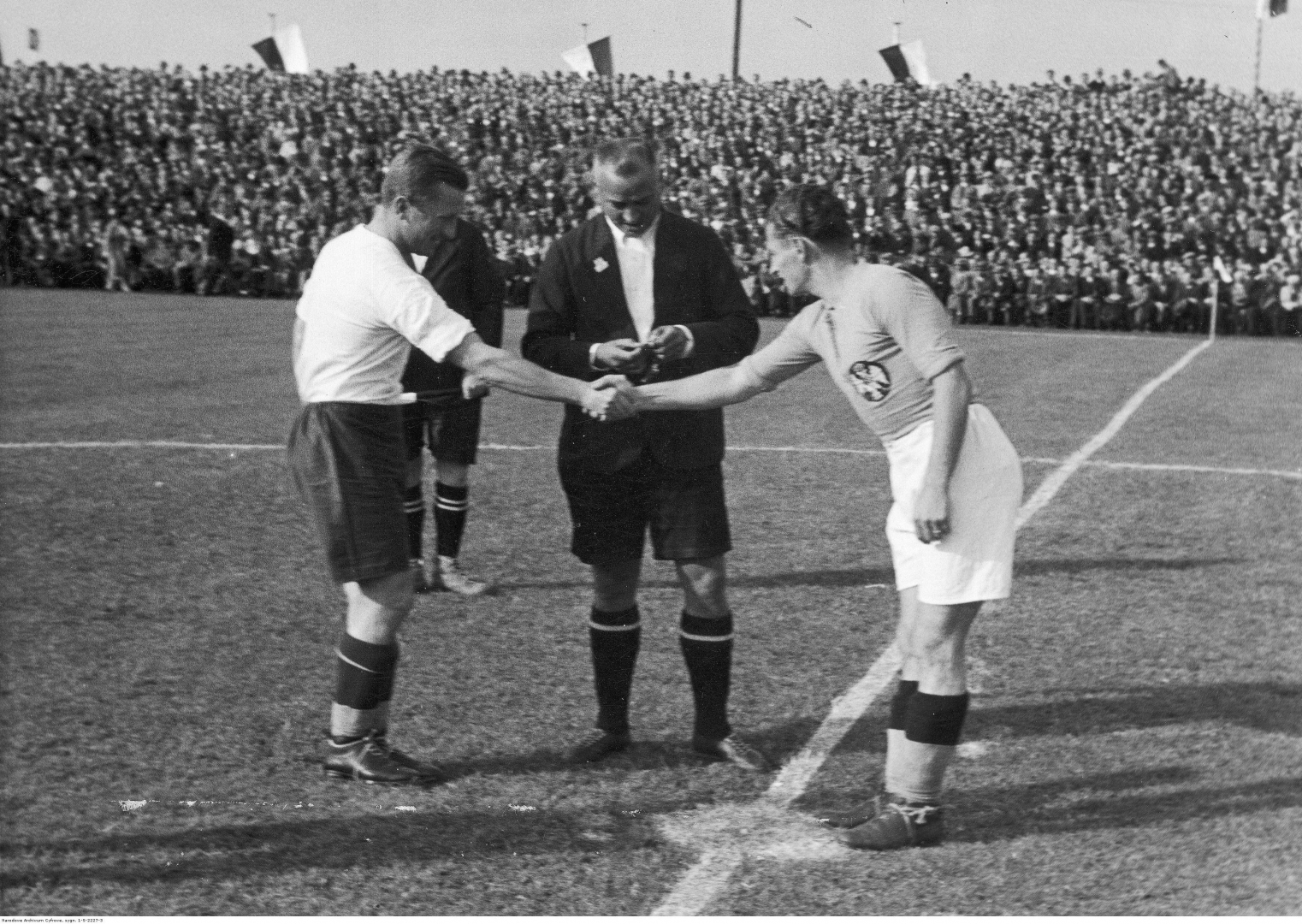 Mecz piłki nożnej Polska - Jugosławia na stadionie Pogoni w Katowicach 18.08.1935 r. share Podziel się facebook google + twitter linkedin clipboard envelope print quote picture add × Cytowane źródła Cytowanie źródła on-line, czyli Internetowego Polskiego Słownika Biograficznego Mecz piłki nożnej Polska - Jugosławia na stadionie Pogoni w Katowicach 18.08.1935 r., [online] Warszawa: Narodowy Instytut Audiowizualny [dostęp 28.02.2026]. Dostępny w internecie: http://www.biogramy.pl/a/foto/mecz-pilki-noznej-polska-jugoslawia-na-stadionie-pogoni-w-katowicach-18081935-r-1 Cytowanie wydania drukowanego, czyli Polskiego Słownika Biograficznego , Mecz piłki nożnej Polska - Jugosławia na stadionie Pogoni w Katowicach 18.08.1935 r., [w:] Polski słownik biograficzny, t. , IPSBID: ipsb-fo-97006 × Wyślij link do strony E-mail odbiorcy wiadomości: To pole jest wymaganeWpisz poprawny adres e-mail Twój adres e-mail: To pole jest wymaganeWpisz poprawny adres e-mail Podgląd wiadomości, która zostanie wysłana: Witaj, [Tutaj podany Twój e-mail] poleca Ci treść z iPSB (internetowym Polskim Słowniku Biograficznym) Mecz piłki nożnej Polska - Jugosławia na stadionie Pogoni w Katowicach 18.08.1935 r. × Dodaj do kolekcji wybierz kolekcję, do której chcesz dodać ten artykuł: lub wpisz nazwę nowej kolekcji, do której chcesz dodać ten artykuł: : To pole jest wymagane Dodaj do kolekcji Wybierz kolekcję Swoje kolekcje znajdziesz w profilu. Wystarczy kliknąć ikonę zębatego koła w górnym prawym rogu. Możesz je zobaczyć tu: moje kolekcje. × Dodaj do kolekcji Element został dodany do Twojej kolekcji. Swoje kolekcje możesz zobaczyć tu: moje kolekcje. × Dodaj do kolekcji Aby dodawać materiały do kolekcji musisz się zalogować. OPIS POSTACI POWIąZANE Moment powitania kapitanów drużyn. Z lewej strony stoi kapitan Jerzy Bułanow, z prawej Gustav Lechner a w środku sędzia Alfred Birlem z Niemiec. Fotografia Czesława Datki. Postaci powiązane Jerzy Bułanow 1903-04-29 - 1980-03-18 piłkarz więcej >> Zobacz zdjęcie w najwyższej jakości Źródło