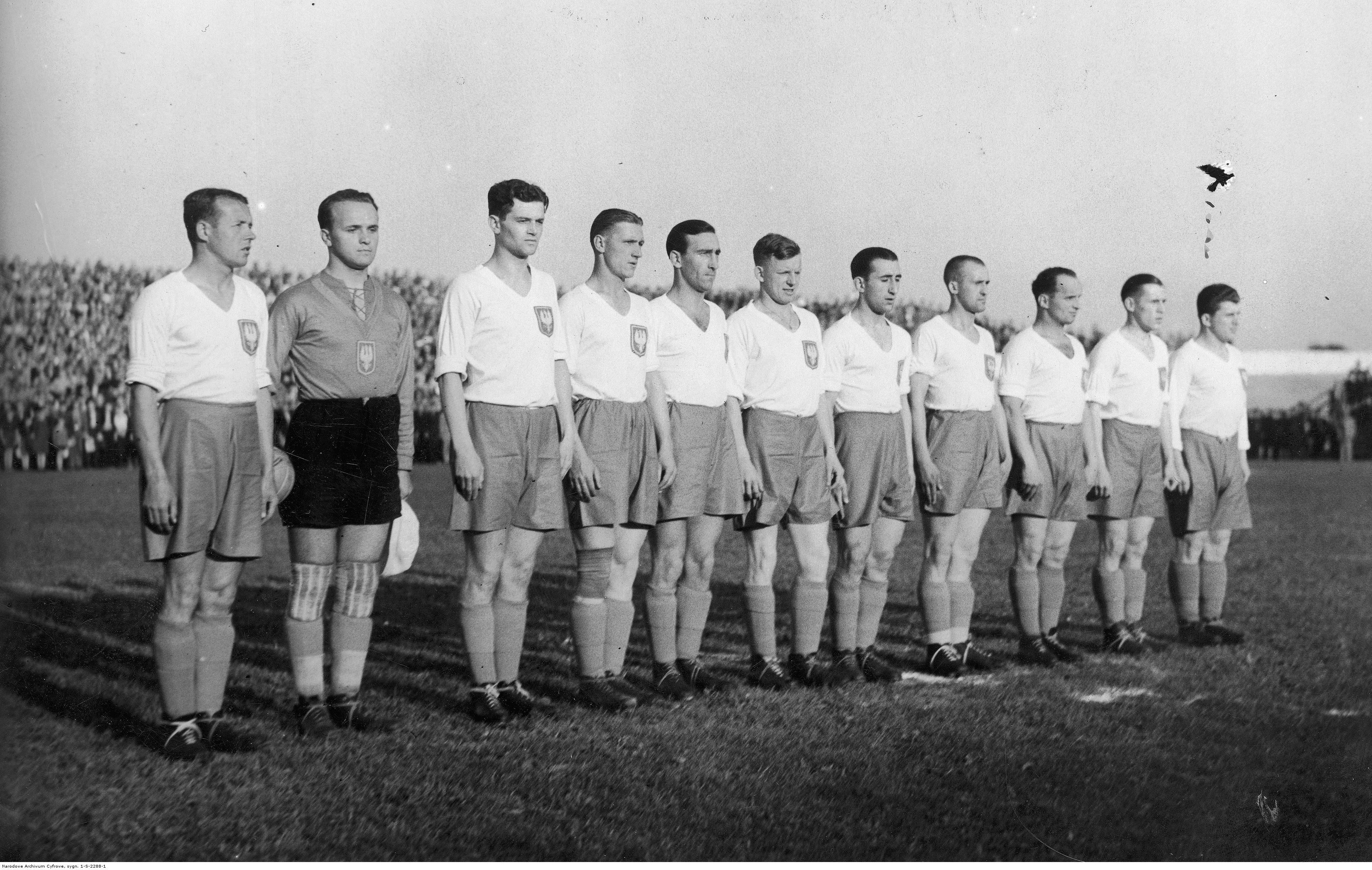 Drużyna Polski. Widoczni: kapitan Józef Kotlarczyk (1. z lewej), bramkarz Edward Madejski (2. z lewej), Jan Wasiewicz (5. z lewej), Ernest Wilimowski (6. z lewej), Leonard Piątek (5. z prawej), Edmund Giemsa (1. z prawej), Władysław Szczepaniak (2. z prawej), Kajetan Kryszkiewicz, Ryszard Piec, Fryderyk Scherfke (lub Szerfke), Gerard Wodarz.