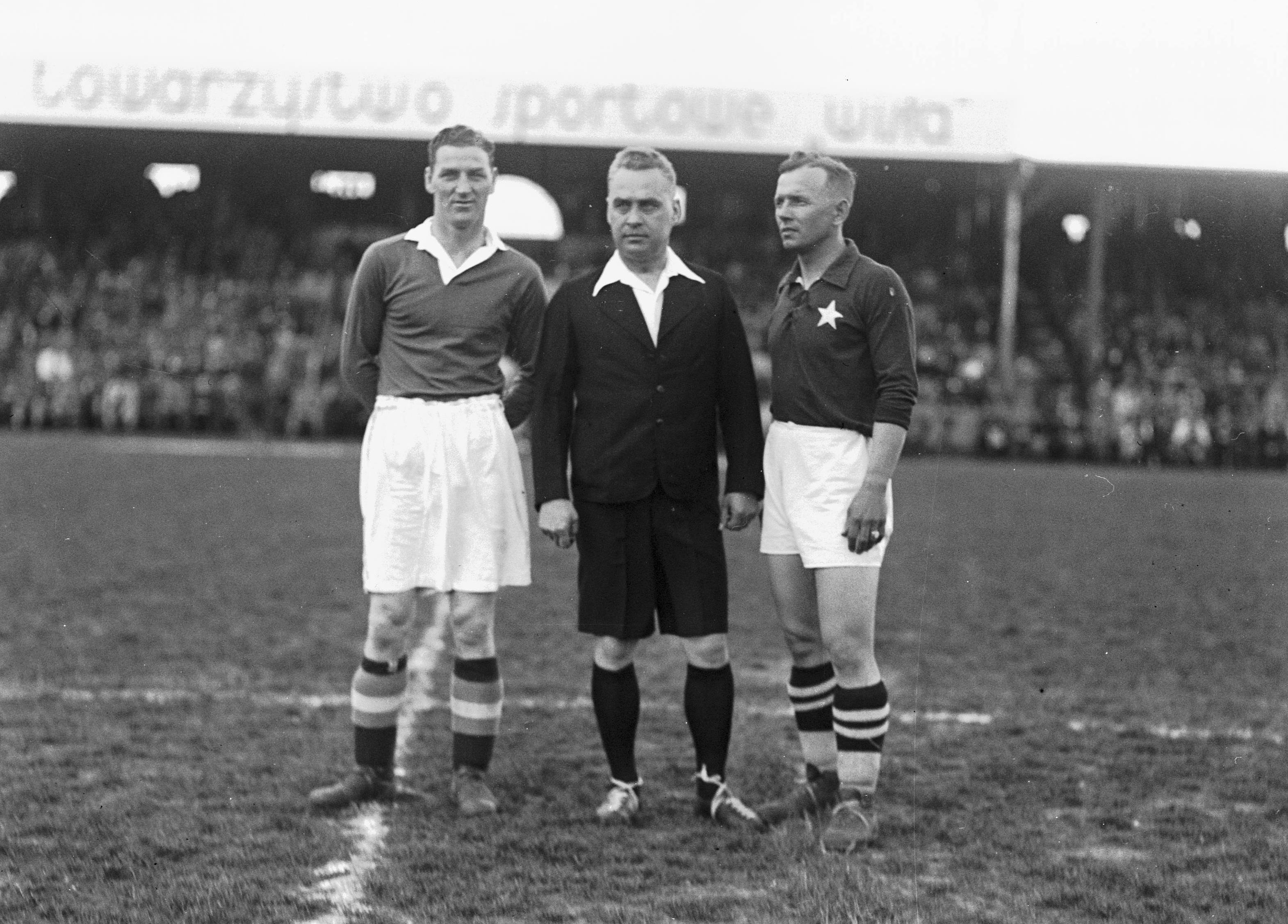 Sędzia Andrzej Rutkowski i kapitanowie drużyn Allan Craigh (Chelsea FC, z lewej) i Jan Kotlarczyk na boisku przed meczem.