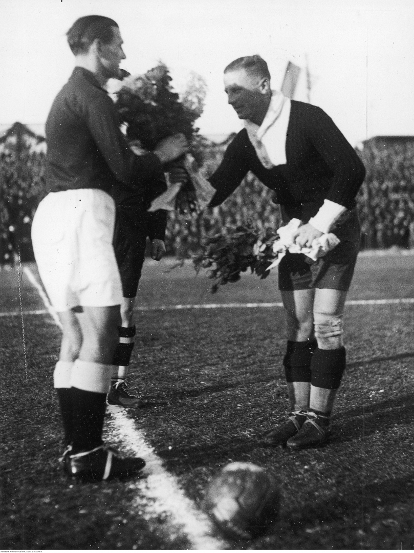 Powitanie kapitanów obu drużyn piłkarskich przed rozpoczęciem meczu. Kapitan Polski Jerzy Bułanow (po prawej), kapitan Niemiec Stanislaus Kobierski.