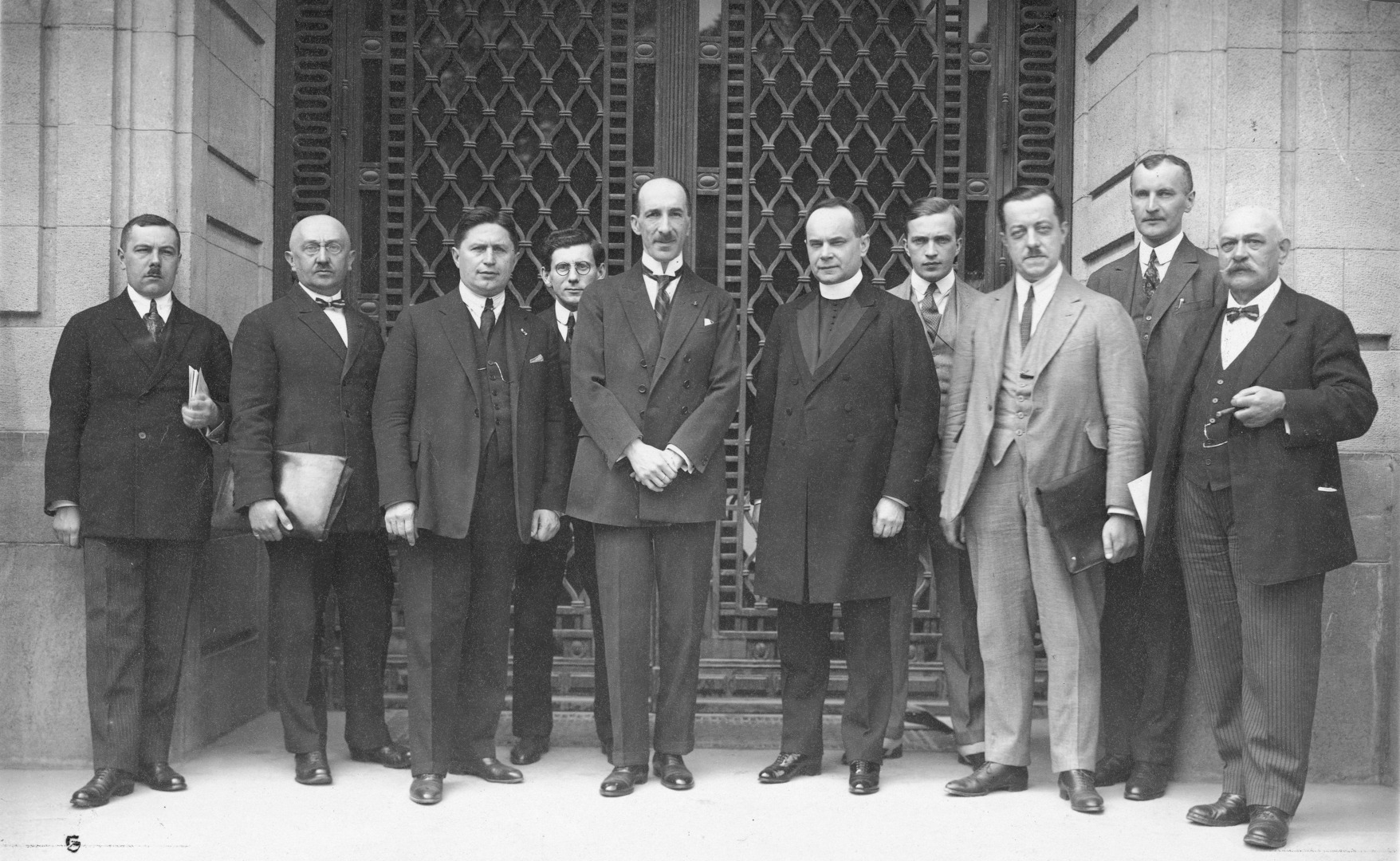 Delegacja polska na VII Posiedzenie Międzynarodowej Konferencji Pracy w Genewie. Widoczni na pierwszym planie od lewej: poseł Ludwik Waszkiewicz, Stanisław Okolski, prawnik Stanisław Jurkiewicz, minister pracy i polotyki społecznej Franciszek Sokal, poseł Aleksander Wóycicki, poseł Bronisław Ziemięcki, redaktor Teller. Stoją z tyłu: Horowitz, Michał Potulicki, Skokowski.