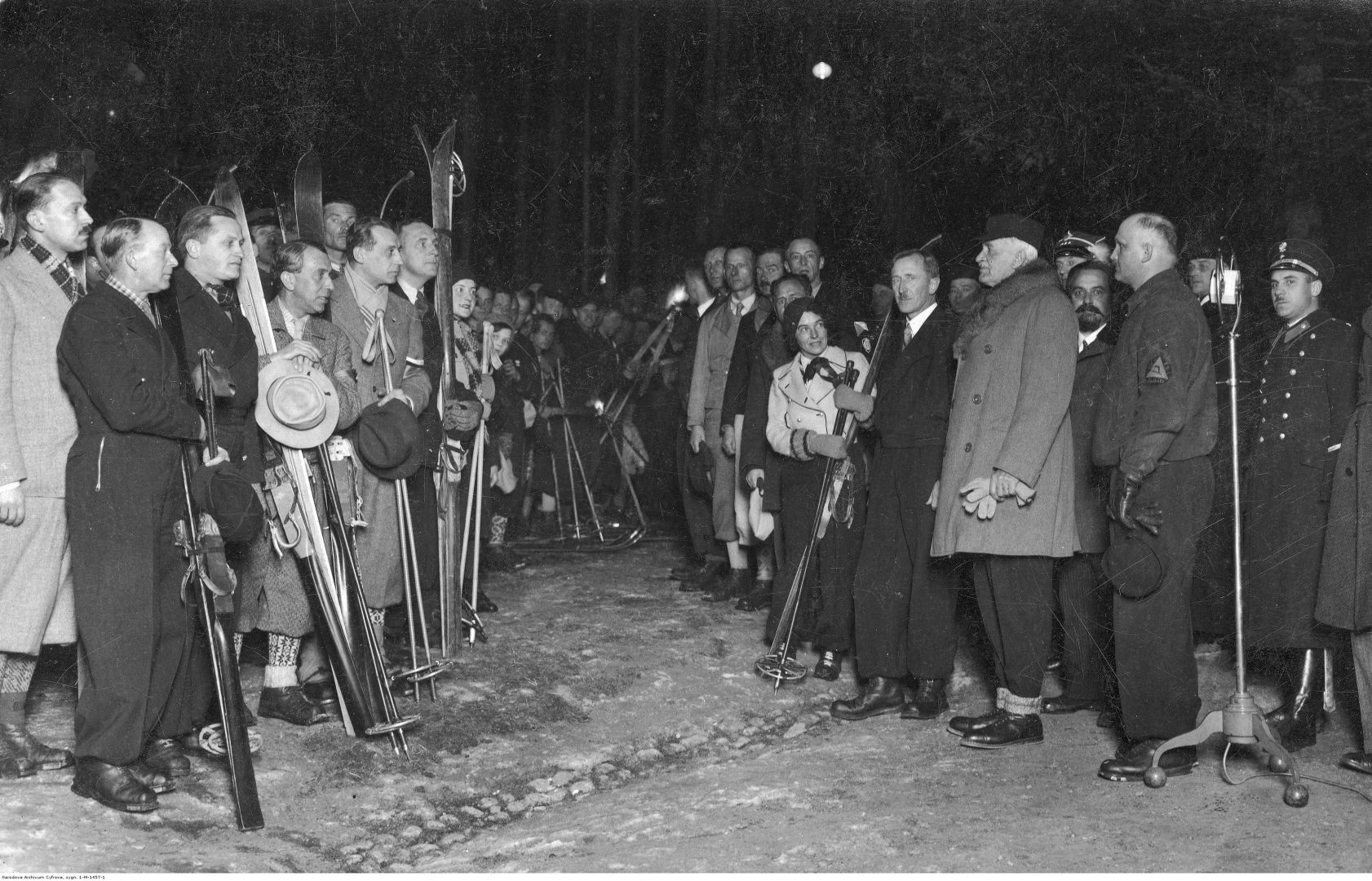 Widoczni m.in.: prezydent RP Ignacy Mościcki (stoi z prawej, w palcie z futrzanym kołnierzem), prezes Polskiego Związku Narciarskiego Aleksander Bobkowski (stoi obok prezydenta), narciarka Janina Loteczkowa (stoi z prawej z nartami), za nią stoją: dr Kmet, dr Zadak z Polskiego Związku Narciarskiego, dr Aleksander Boniecki, dr Bolesław Macudziński, redaktor Stanisław Facher, dr Harhat-Załuski, adiutant prezydenta RP kpt. Józef Hartman (na lewo za prezydentem, w rogatywce z piórkiem).