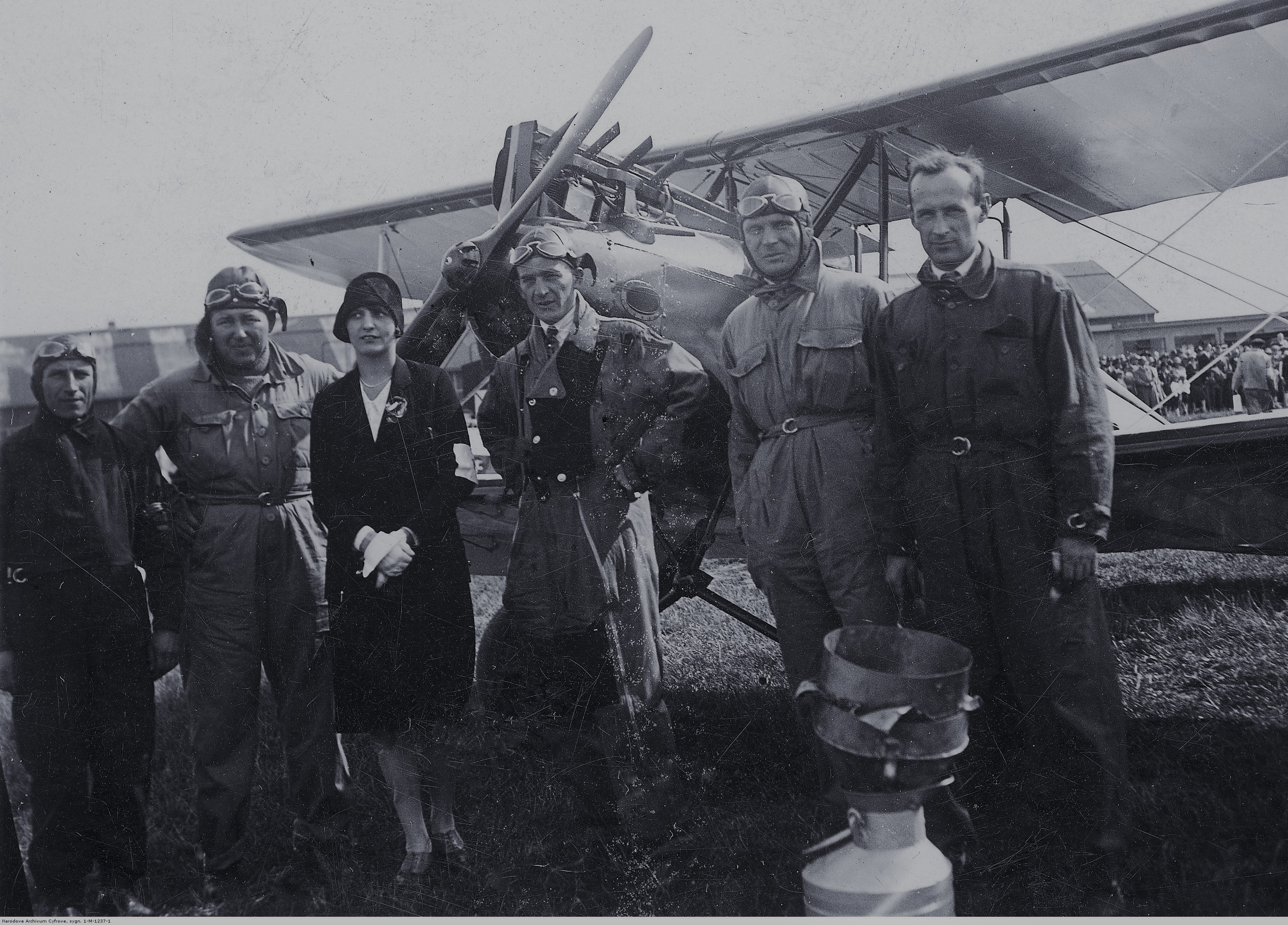 Grupa osób przed samolotem PZL.5 na lotnisku we Frankfurcie nad Menem. Stoją od lewej: konstruktor lotniczy inż. Adam Karpiński, kapitan pilot Bolesław Orliński, żona wicekonsula pani Odrowąż-Wysocka, Lubomirski, starszy sierżant pilot Józef Muślewski.