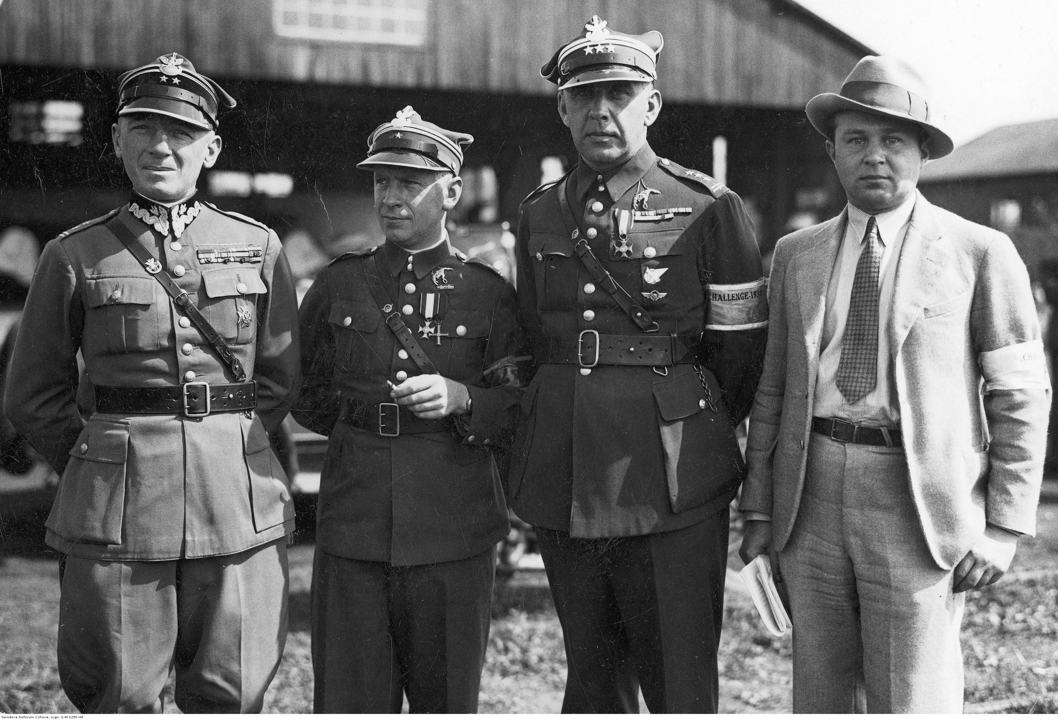 Pułkownik Kazimierz Glabisz, kapitan Stanisław Skarzyński, pułkownik Władysław Kalkus i redaktor Władysław Mart (stoją od lewej) obserwują odlot samolotów.