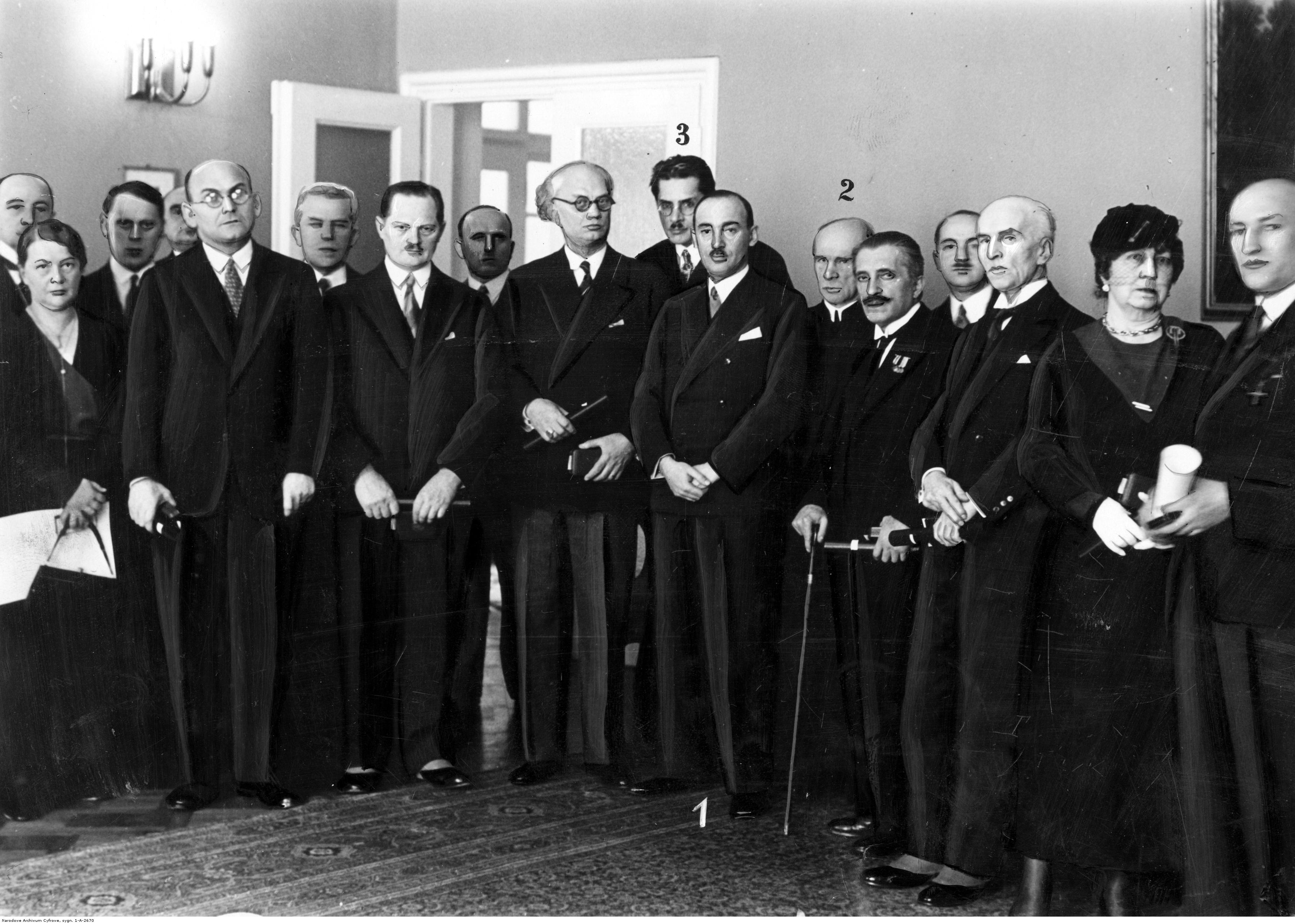 , Minister Wacław Jędrzejewicz w towarzystwie osób ze świata nauki, kultury i sztuki udekorowanych odznaczeniami państwowymi w marcu 1934 r., [w:] Polski słownik biograficzny, t. ,