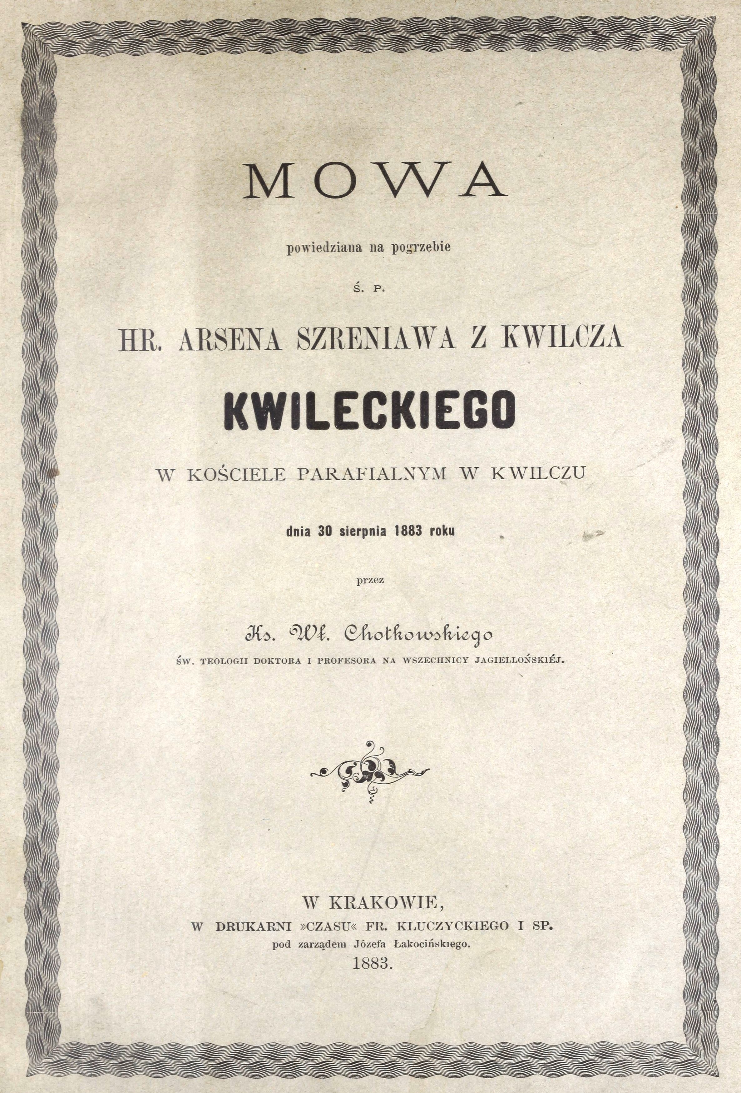 Strona tytułowa broszury z mową pogrzegową wydana w Krakowie w 1883 roku.