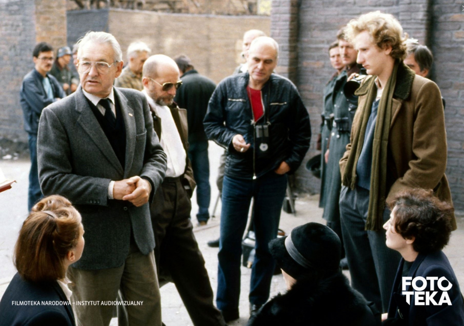 Na zdjęciu widoczni są obok Andrzeja Wajdy, aktor Wojciech Pszoniak (drugi z lewej), aktor Piotr Kozłowski (z prawej), aktorka Ewa Dałkowska (siedzi z prawej) i współpracownik reżysera Andrzej Kotkowski.