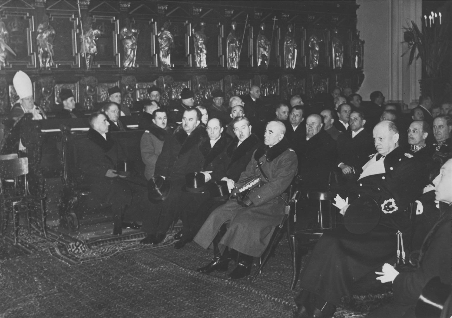 Fragment nabożeństwa w intencji p. papieża Piusa XI. Widoczni m.in.: ambasador Niemiec w Polsce Hans von Moltke (1. z prawej, w mundurze), marszałek Polski Edward Rydz-Śmigły (2. z prawej), wicepremier Eugeniusz Kwiatkowski (3. z prawej), senator Bogusław Miedziński (4. z prawej), senator Aleksander Prystor (siedzi w drugim rzędzie za marszałkiem Rydzem - Śmigłym), prezes NIK Jakub Krzemieński (1. z lewej w pierwszej ławce), ks. arcybiskup Stanisław Gall (z lewej, w pierwszej stalli), minister sprawiedliwości Witold Grabowski (na lewo za Aleksandrem Prystorem), ambasador brytyjski Howard Kennard (z wąsami i w okularach, na lewo za ambasadorem Niemiec H. von Moltke).