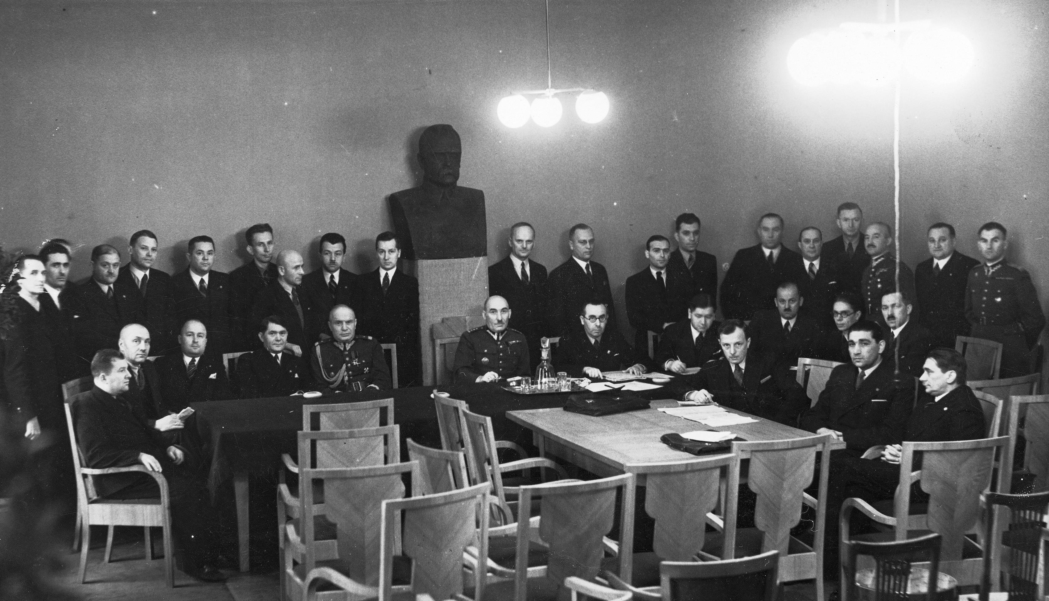 Od lewej siedzą m.in.: prezes Łódzkiego Związku Piłki Nożnej Heliodor Konopka (4.), prezes Polskiego Związku Piłki Nożnej gen. Władysław Bończa-Uzdowski (5.), wiceprezes WKS Legia Karol Rudolf (6.), dr Statter (7.). W drugim rzędzie na prawo od popiersia marszałka Józefa Piłsudskiego stoją: Prezes Ligi Piłki Nożnej mjr dr Zygmunt Żołędziowski (2.), sekretarz generalny Polskiego Związku Piłki Nożnej inż. Michał Merliński (3.), selekcjoner reprezentacji Polski Andrzej Przeworski (4).