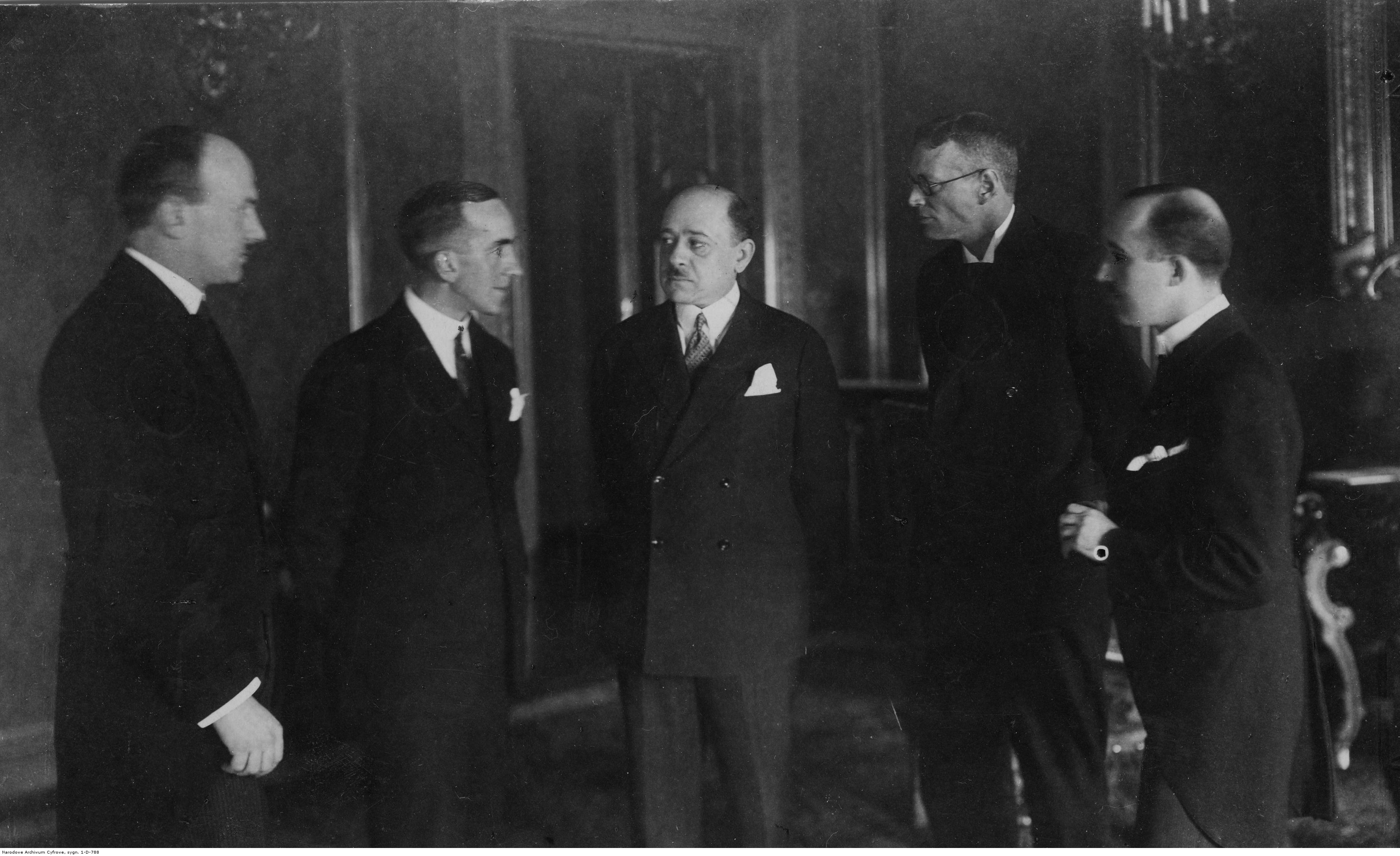 Przedstawiciel rządu irańskiego i delegaci rządu polskiego uczestniczący w rozmowach na temat stosunków politycznych i gospodarczych między Polska a Iranem, w salonie konferencyjnym Prezydium Rady Ministrów. Widoczni: Roman Knoll (drugi z lewej), przedstawiciel rządu irańskiego Yamine Khanghan Assad Khan (Assad Bahador, trzeci z lewej), Tadeusz Skowroński (drugi z prawej), Węcławicz, (pierwszy z lewej) oraz Jan Grabowiecki-Grzymała (pierwszy z prawej).