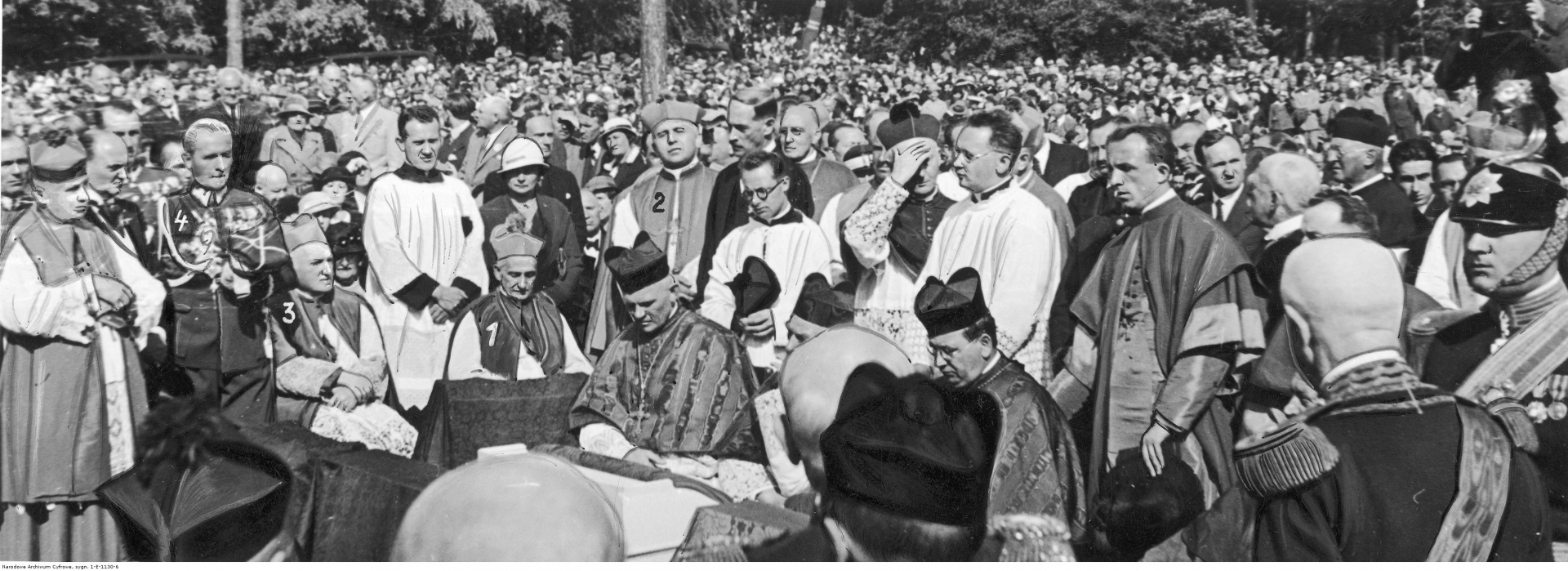 Przedstawiciele episkopatów przed kościołem św. Józefa na Kahlenbergu. Widoczni m.in.: abp. Adam Sapieha (1), bp pol. Józef Gawlina (2), abp Józef Teofil Teodorowicz (3), gen. Bolesław Wieniawa-Długoszowski (4) i kard. Theodor Innitzer (siedzi przed arcybiskupem Sapiehą, przy jasnym klęczniku).