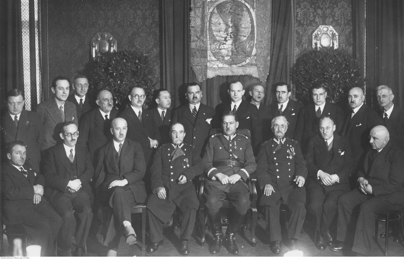Siedzą od prawej: Stefan Piechocki, wicestarosta krajowy poznański Józef Głowacki, weteran Józef Winnicki, generał Oswald Frank, weteran Michał Michalski, reprezentant wojewody Macko, radca magistratu m. Poznania Zygmunt Zaleski, członek zarz. Okręg. Związ. Inwali. Wojennych RP w Poznaniu Antoni Joachimiak. Wśród stojących mężczyzn widoczny prez. zarz. Okręg. Związ. Inwalidów Wojennych RP w Poznaniu Ludwik Stachecki (7. z lewej).