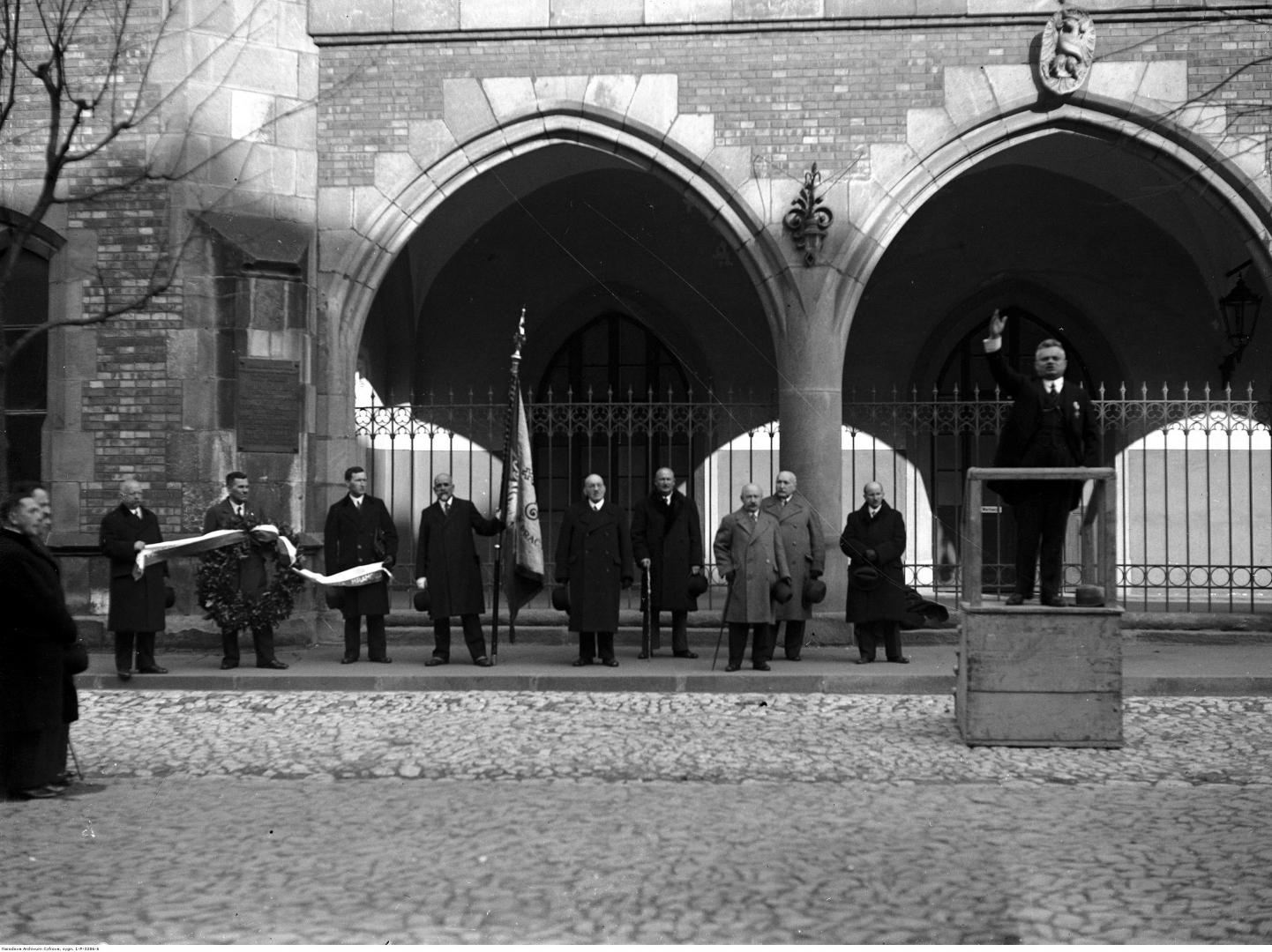 Uczestnicy uroczystości w październiku 1934 roku zebrani przed odwachem przy ratuszu na Rynku Głównym. Na mównicy stoi prezes Związku Oswobodzenia m. Krakowa Henryk Pachoński.