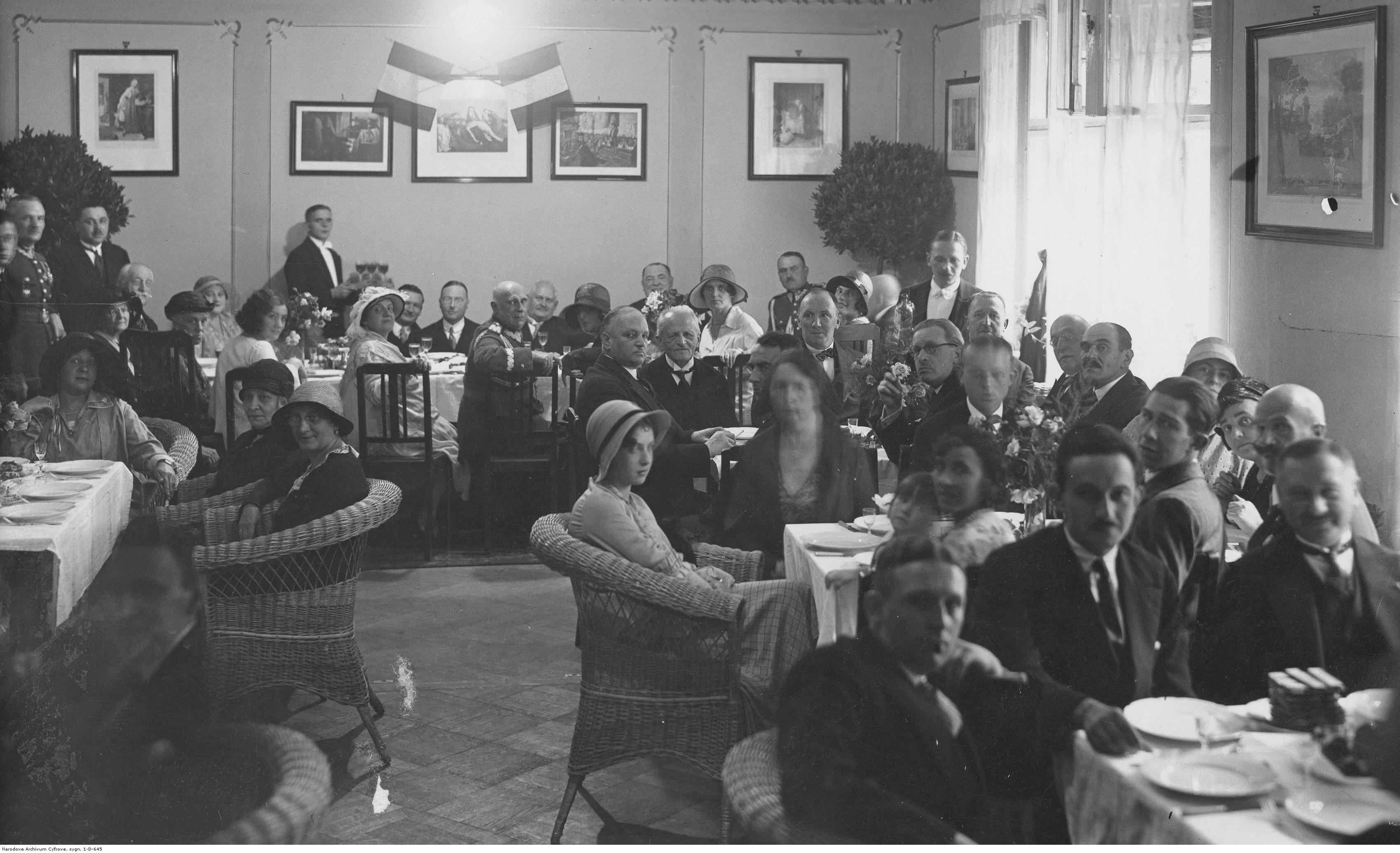 Przyjęcie wydane przez konsula Francji w Poznaniu Jean'a Jacques'a Serre w salonach Towarzystwa Polsko-Francuskiego z okazji święta narodowego Francji. Przy stołach widoczni m.in.: wojewoda poznański hr. Roger Raczyński, prezydent Poznania Cyryl Ratajski, płk Franciszek Wład, prezes Towarzystwa Polsko-Jugosłowiańskiego generał Aureli Serda-Teodorski, wiceprezes Towarzystwa Polsko-Francuskiego prof. Bronisław Dembiński, konsul Czechosłowacji w Poznaniu Zdenek Matousek, płk Rudolf Dreszer, skarbnik Towarzystwa Polsko-Francuskiego Maes oraz redaktorka Zarembina.