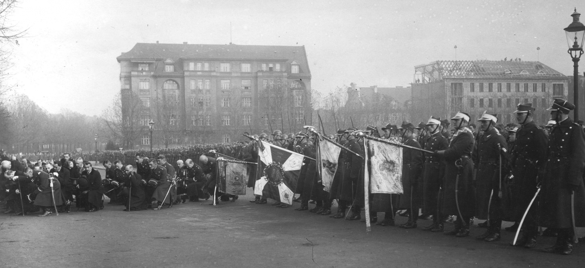 Widok ogólny zgromadzenia podczas mszy polowej. Widoczni m.in. prezydent Poznania Cyryl Ratajski, wojewoda poznański Adolf Bniński, rektor Uniwersytetu Poznańskiego profesor Jan Grochmalicki, Prezes Izby Przemysłowo-Handlowej w Poznaniu Stanisław Pernaczyński.