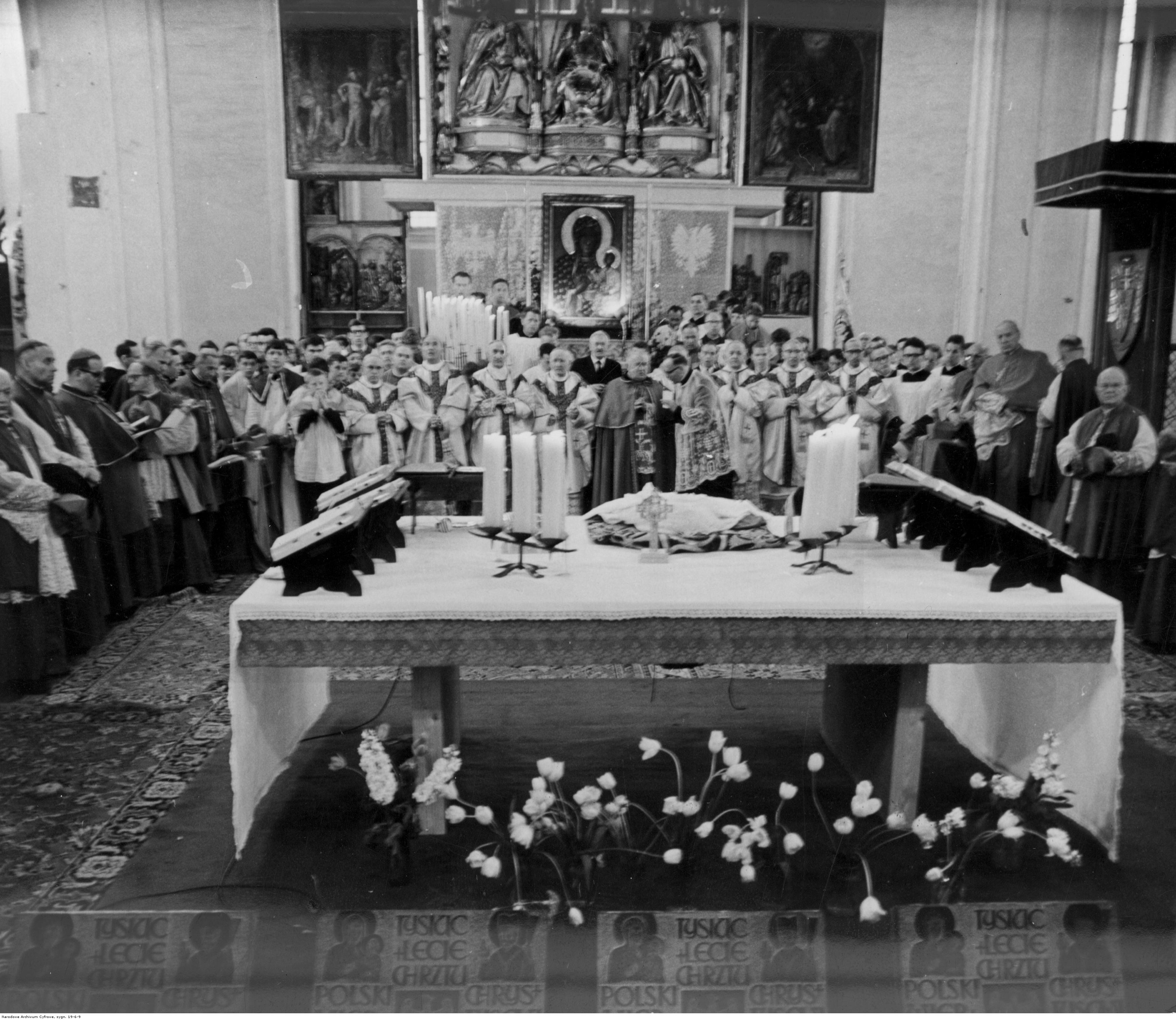 Wśród przedstawicieli episkopatu zgromadzonych przy ołtarzu widoczni są (od lewej): biskup pomocniczy poznański ks. Franciszek Jedwabski, ks. bp Józef Drzazga z Olsztyna, ks. biskup Franciszek Jop z Opola, ordynariusz diecezji siedleckiej ks. bp Ignacy Świrski, ordynariusz diecezji gdańskiej ks. bp Edmund Nowicki, ks. bp Wilhelm Pluta, biskup częstochowski ks. Stefan Bareła, biskup pomocniczy przemyski ks. Bolesław Taborski, ks. Andrzej Żebrowski, NN, kard. Stefan Wyszyński (stoi pod baldachimem, przy klęczniku).