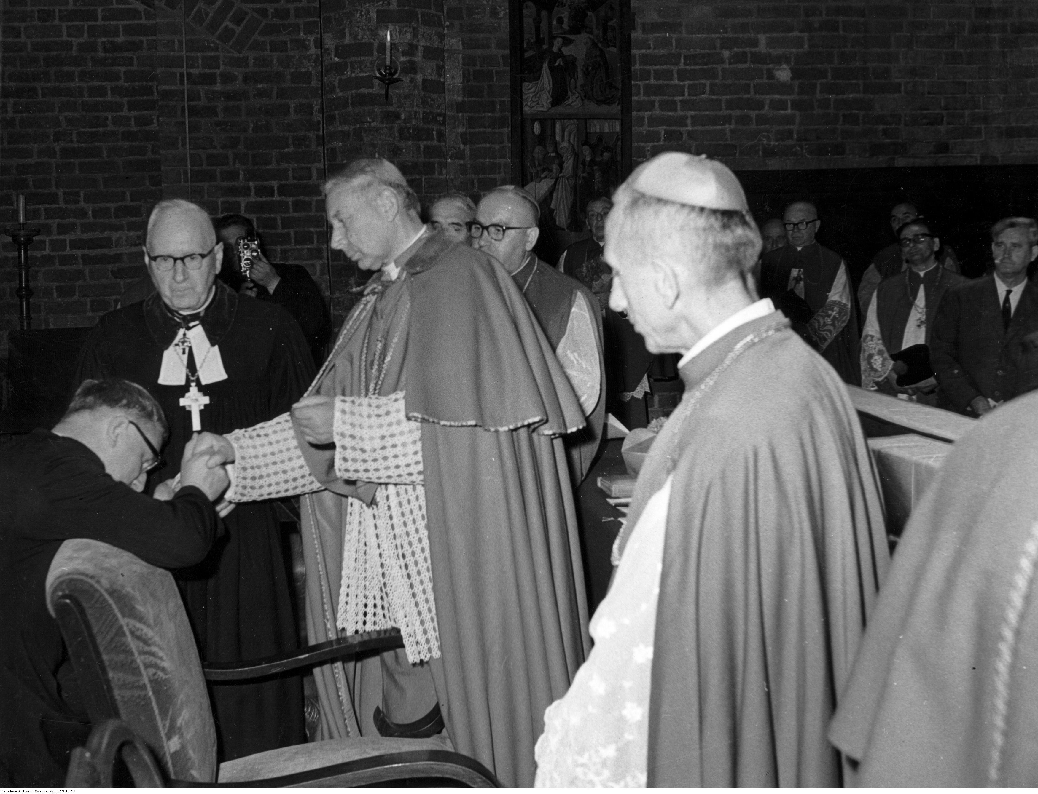 Sesja ekumeniczna i naukowa w bazylice św. Jana. Widoczni m.in.: metropolita poznański ks. arcybiskup Antoni Baraniak (na pierwszym planie 1. z prawej), prymas Polski ks. kard. Stefan Wyszyński (2. z prawej), administrator apostolski diecezji wrocławskiej ks. arcybiskup Bolesław Kominek (w okularach, za prymasem), biskup-adiunkt Kościoła Ewangelicko-Augsburskiego w Polsce pastor Zygmunt Michelis (stoi 1. z lewej).