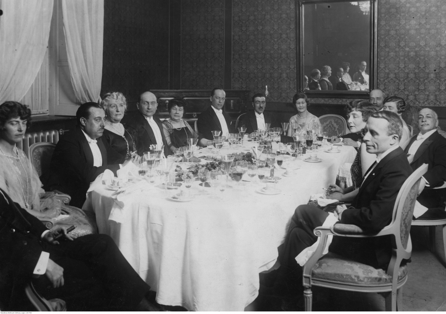 Za stołem siedzą od lewej: hrabina Rzyszczewska, poseł nadzwyczajny i minister pełnomocny Portugalii w Polsce Vasco de Quevedo, pani Henrietta Perłowska, minister spraw zagranicznych August Zaleski, hrabina Walewska, radca MSZ Konstanty Jeleński, sekretarz Poselstwa Hiszpanii w Polsce Muns, pani Ewelina Zaleska, poseł Jan Perłowski i pani Muns.