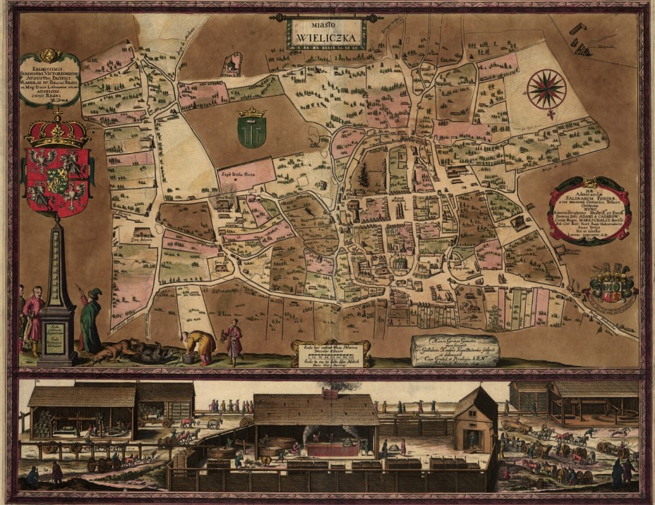 Z prawej strony widoczny obelisk z dedykacją dla króla Władysława IV. Plan miasta Wieliczka i plany trzech poziomów Żup Wielickich. Plan Wieliczki ozdobiony jej herbem (posułt między dwoma kilofami). Z lewej strony kartusz z dedykacją dla króla Władysława IV, niżej pięciopolowa tarcza z herbem królewskim. Z prawej strony kartusz z dedykacją dla marszałka Adama Kazanowskiego. Poniżej planu rycina przedstawiajaca naziemne budynki kopalni i sceny transportu soli.
