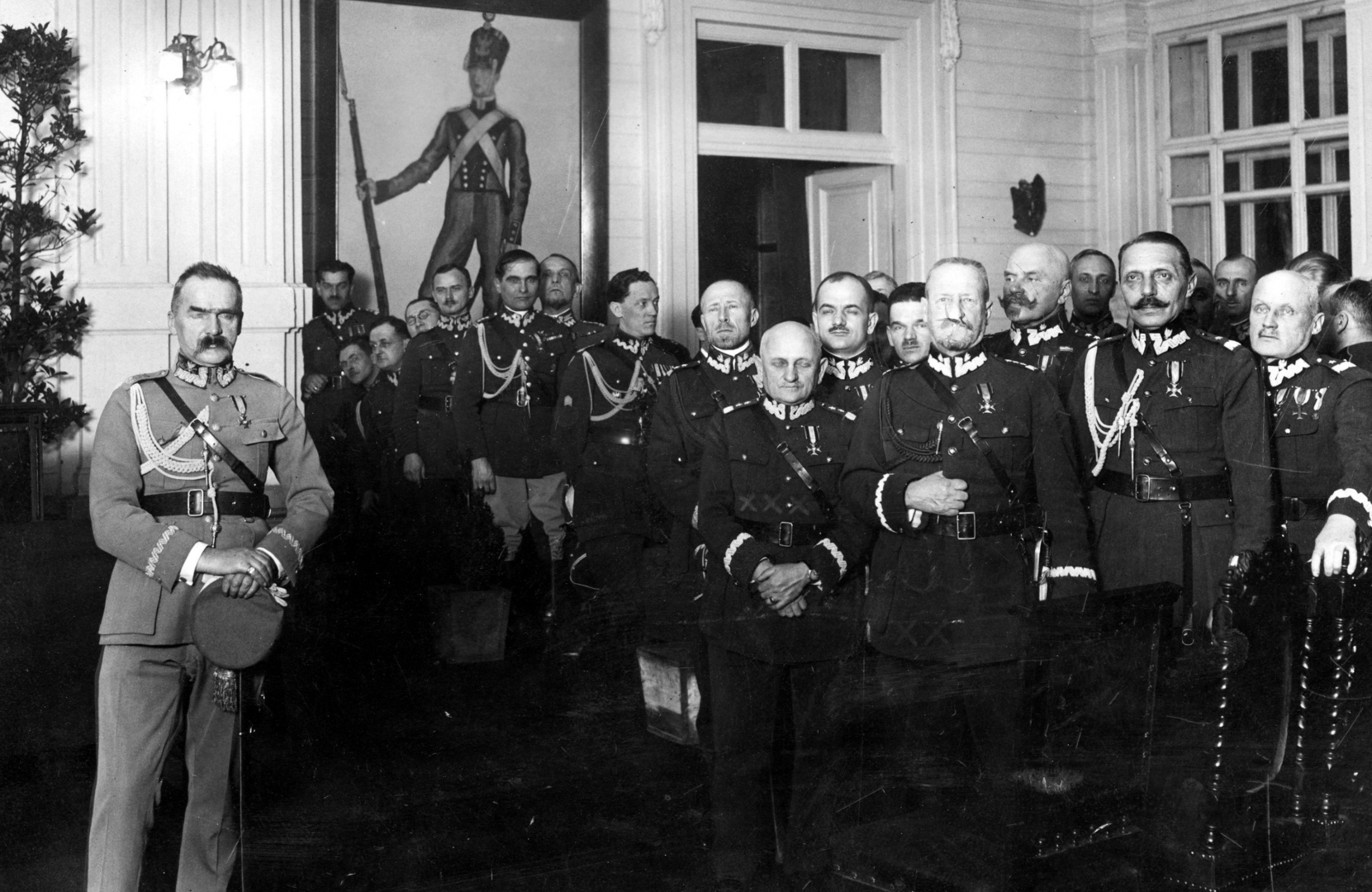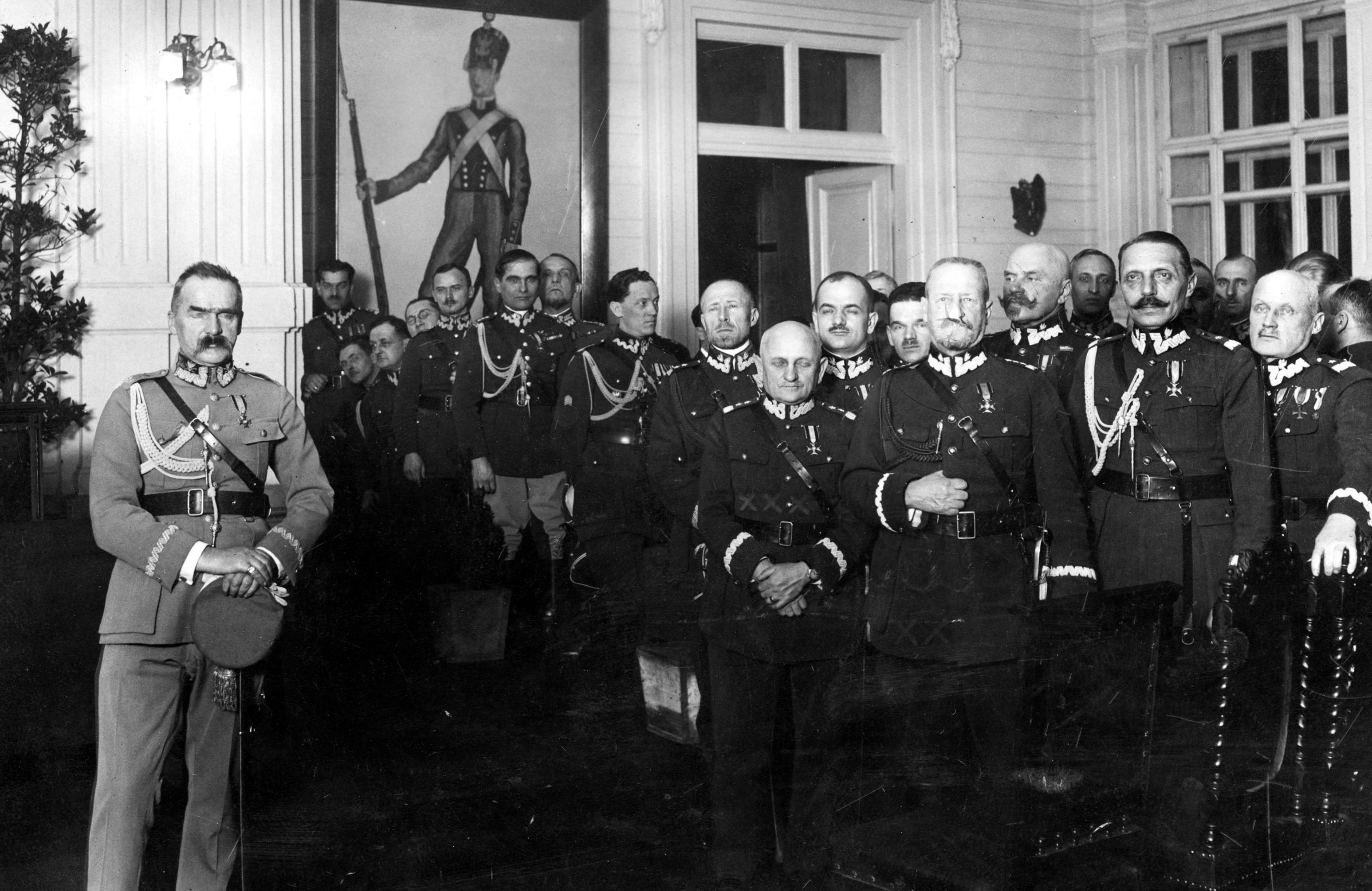 Marszałek Polski Józef Piłsudski z członkami Koła Oficerów Sztabu Generalnego. Widoczni m.in. na pierwszym planie: gen. Jan Wróblewski (2. z prawej), minister spraw wojskowych Lucjan Żeligowski (3. z prawej), generał Leonard Skierski (4. z prawej) oraz generał Daniel Konarzewski (stoi za gen. L. Żeligowskim), gen. Roman Górecki (na prawo za gen. Skierskim), płk Sergiusz Zahorski, płk Janusz Jagrym-Maleszewski, por. Michał Galiński (na prawo od gen. Góreckiego).