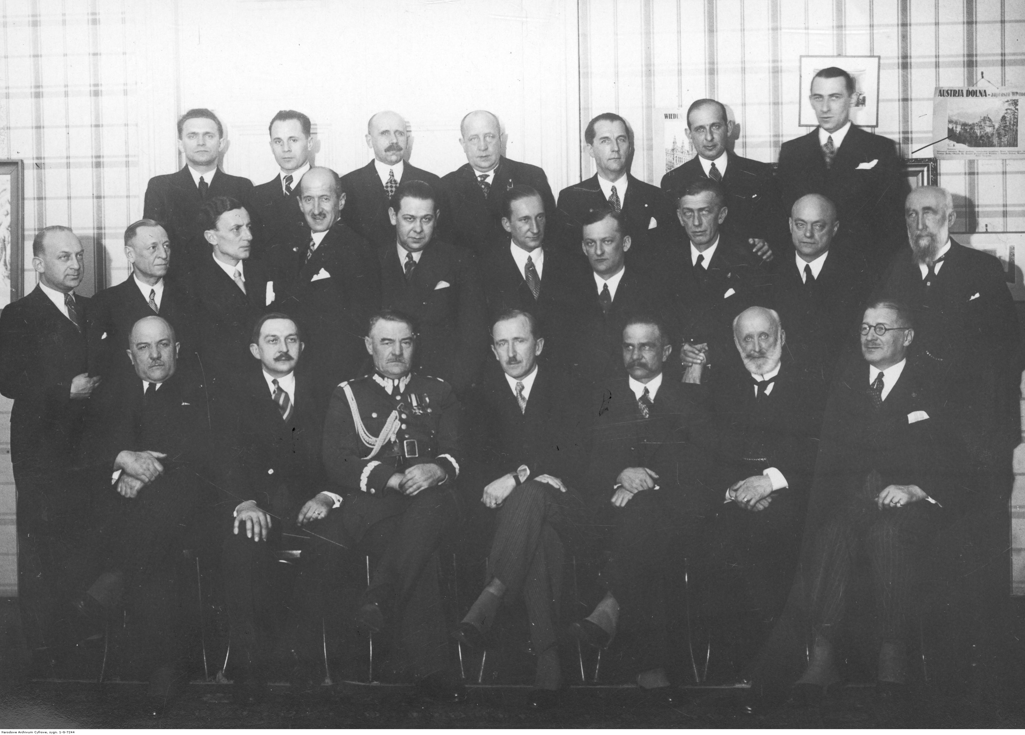 W pierwszym rzędzie siedzą od lewej: prezes lwowskiego oddziału Ligi Drogowej Greger, prezes Zarządu Głownego Ligi Drogowej Stefan Tyszkiewicz, generał Bolesław Popowicz, wiceminister komunikacji Aleksander Bobkowski, wojewoda lwowski Władysław Belina-Prażmowski, hrabia Jan Potocki, wiceprezes Izby Przemysłowo-Handlowej we Lwowie Wiktor Hłasko.
