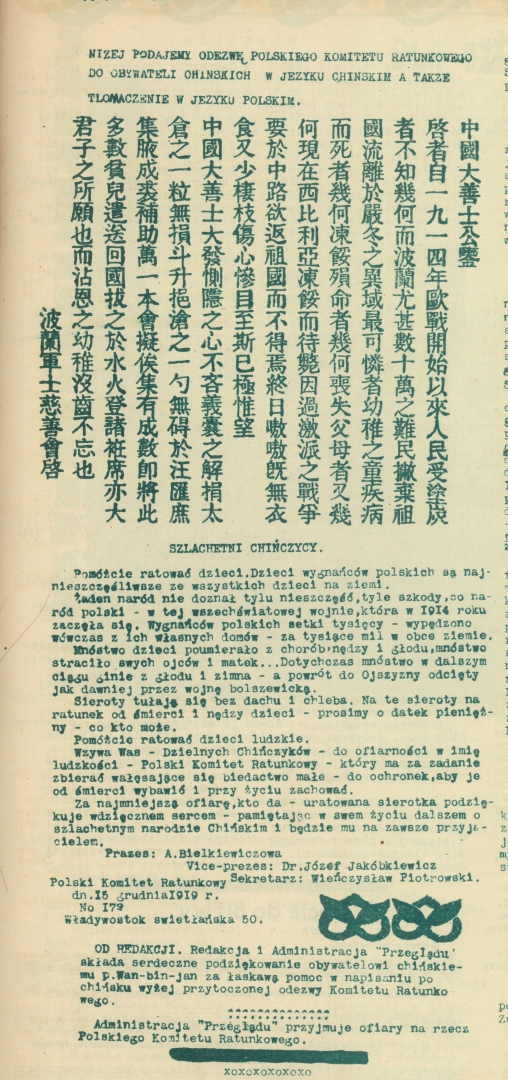 Odezwę opublikowano w dwóch językach - chińskim i polskim - w czasopiśmie: Przegląd. Dwutygodnik narodowy literacko-społeczno-ekonomiczny z uwzględnieniem działu dla dziatwy. Organ Związku Wojennego w Charbinie; Nº 18, 15 Stycz.[nia] 1920, s.13.