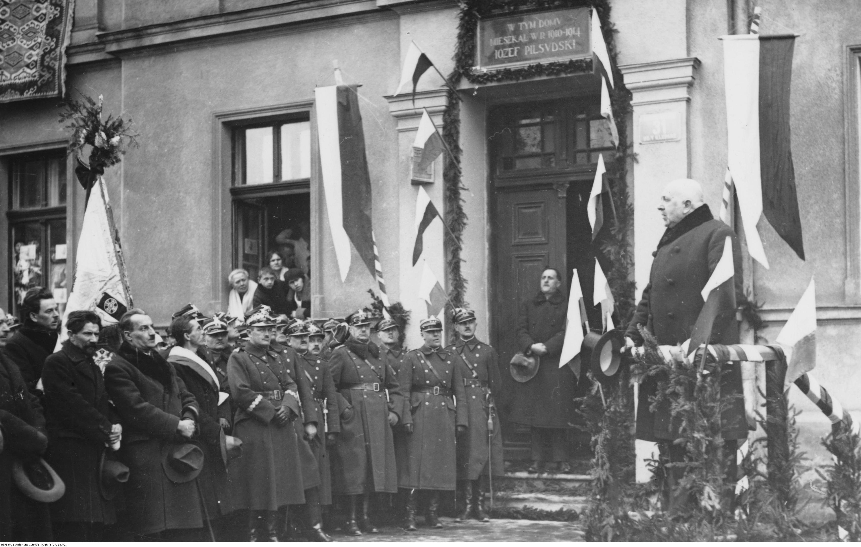 Przemawia prezydent Krakowa Karol Rolle. W drzwiach widoczny poseł Bolesław Pochmarski. Napis na tablicy brzmi: "W tym domu mieszkał w r. 1910-1914 Józef Piłsudski".