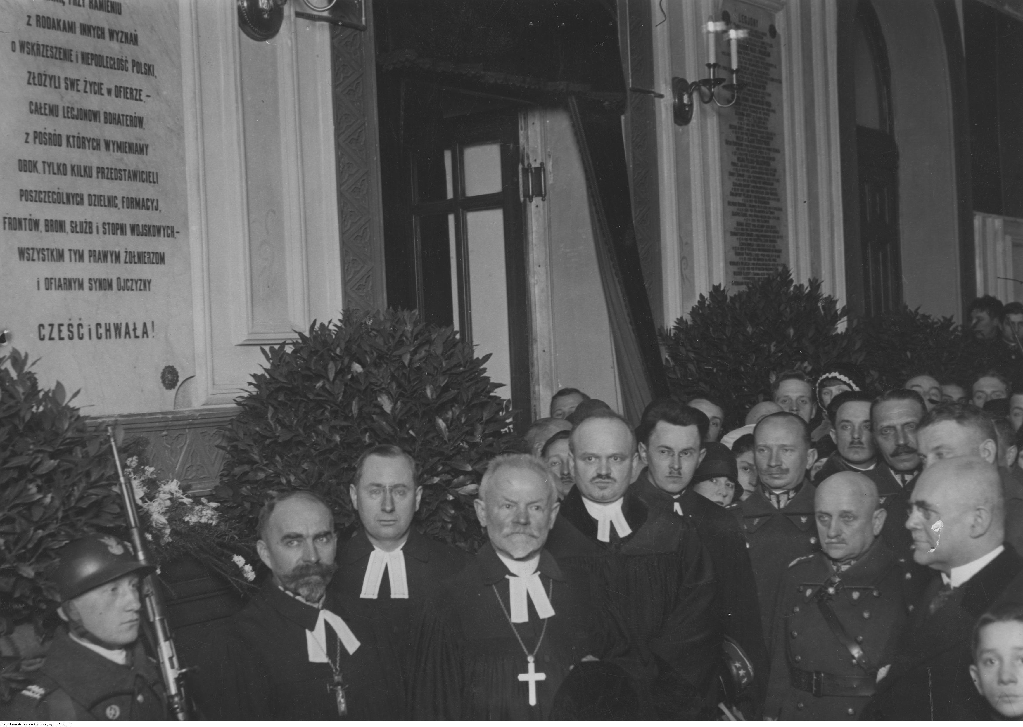 Widoczni m.in.: minister wyznań religijnych i oświecenia publicznego Gustaw Dobrucki (1. z prawej na pierwszym planie), superintendent Kościoła ewangelicko-augsburskiego Juliusz Bursche (w środku na pierwszym planie), gen. Leonard Skierski (2. z prawej), gen. Juliusz Rómmel (na lewo za gen. Skierskim), gen. Jan Wróblewski (na prawo za gen. Skierskim).