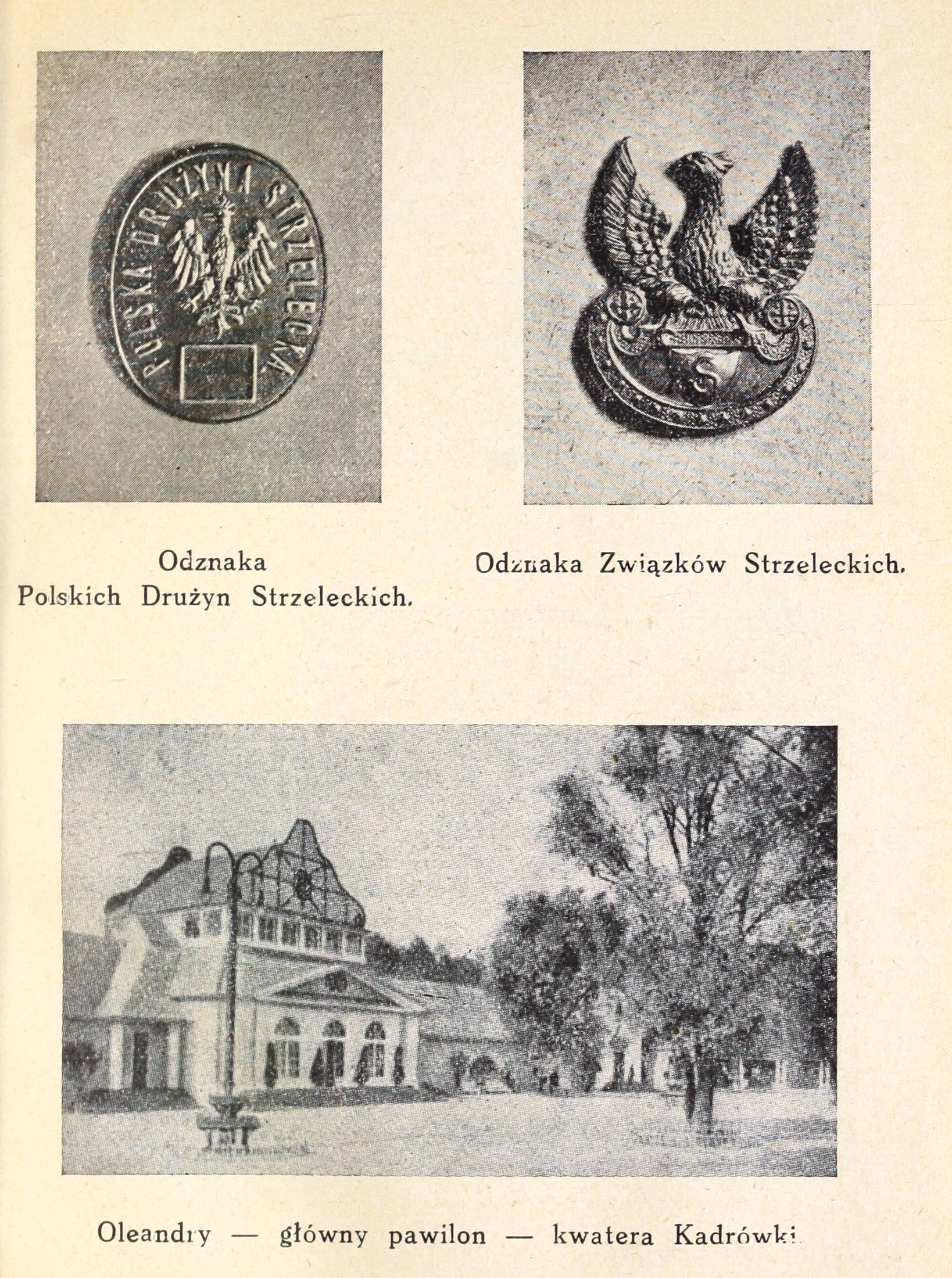, Odznaka Polskich Drużyn Strzeleckich. Odznaka Związków Strzeleckich. Oleandry - główny pawilon - kwatera Kadrówki., [w:] Polski słownik biograficzny, t. ,