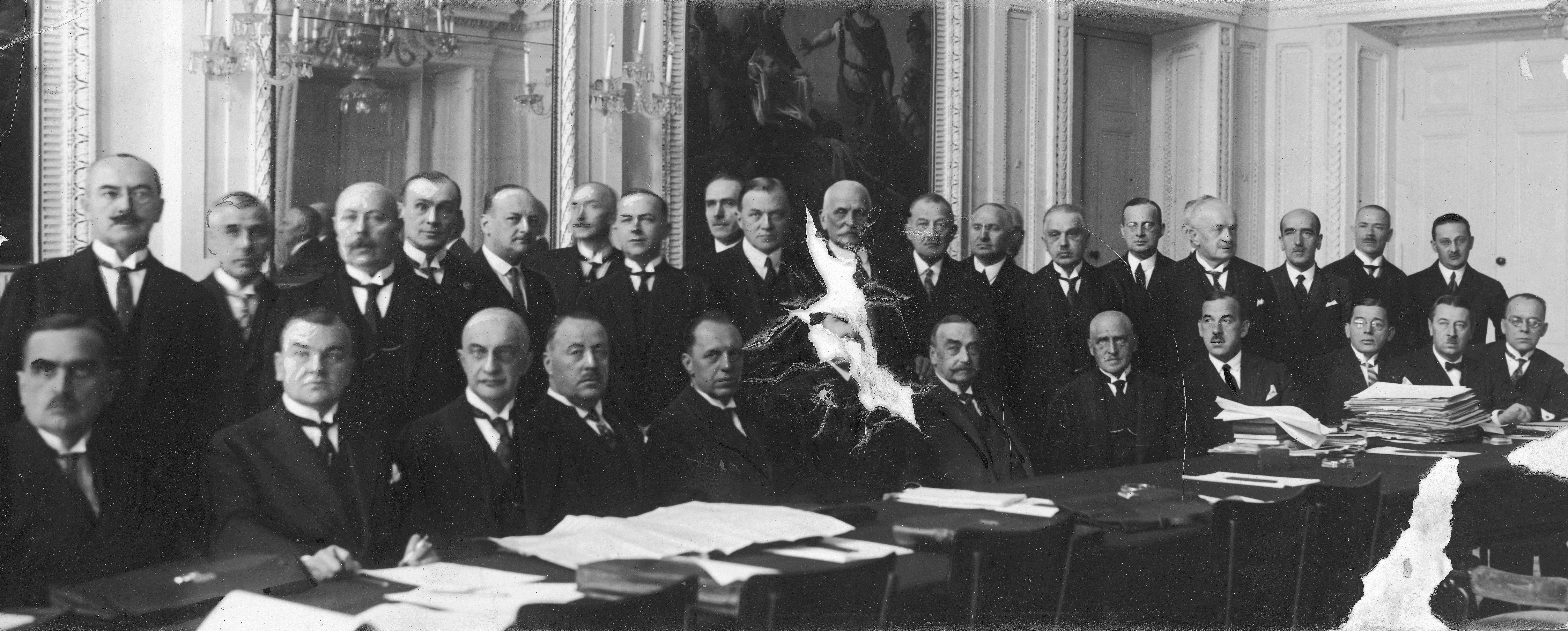 Uczestnicy zjazdu. Widoczni m.in.: Czesław Michałowski (siedzi 2. z lewej), Kazimierz Rudnicki, minister sprawiedliwości Aleksander Meysztowicz (siedzi 6. z prawej), Stefan Sieczkowski (siedzi 4. z prawej), Mieczysław Świątkowski (siedzi 3. z prawej), Stanisław Warmski, Stanisław Batycki, Stefan Lisowski, Kazimierz Izdebski, Józef Skolimowski, Józef Moldenhawer, Aleksander Rasp, Antoni Lewandowski (siedzi 1. z lewej), Zbigniew Piernikarski, Tadeusz Malina, Stefan Kuczyński, Lucjan Bekerman, Tadeusz Marecki, Stanisław Małkowski, Lucjan Jaxa-Maleszewski, Lucjan Bekerman, Stanisław Czerwiński.