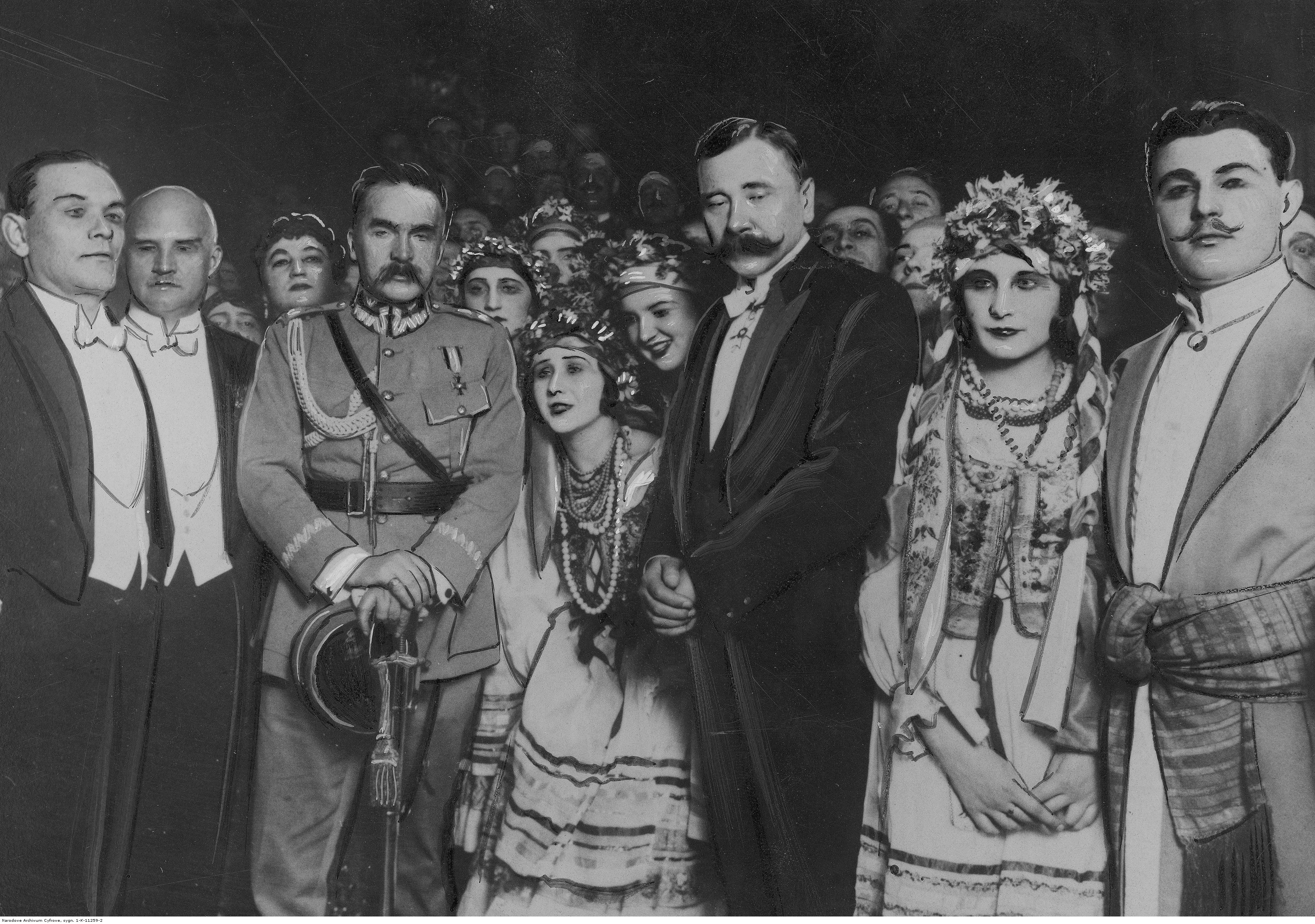 Marszałek Polski Józef Piłsudski (3. z lewej) wśród artystów po przedstawieniu operowym "Straszny dwór" odegranym na jego cześć. W pierwszym rzędzie widoczni m.in. reżyser Adolf Popławski (1. z lewej), dyrektor Emil Młynarski (2. z lewej), dyrektor Artur Śliwiński (3. z prawej), Jan Kiepura grający w operze rolę Stefana (1. z prawej).