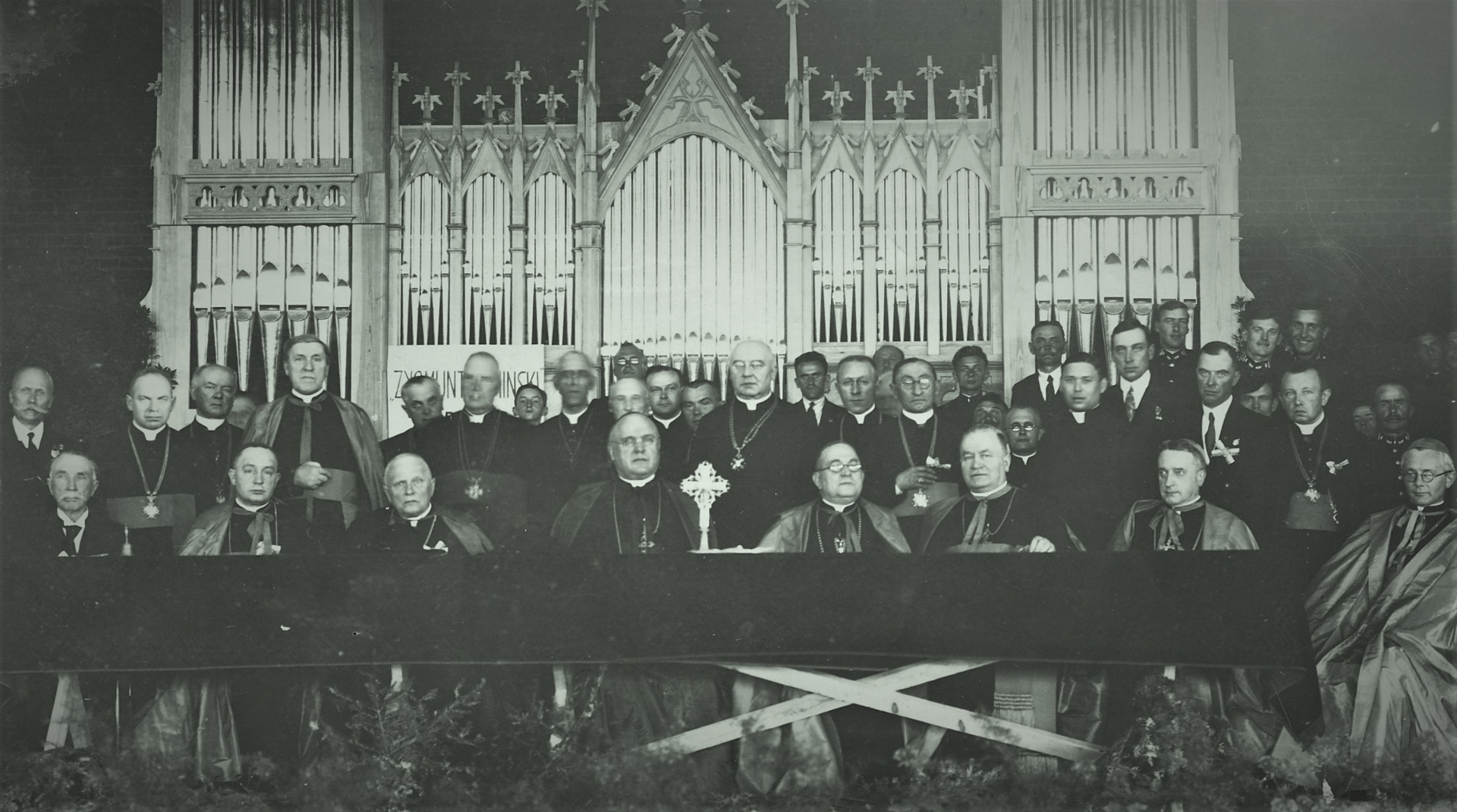 Siedzą przy stole (od lewej) m.in.: biskup pomocniczy płocki Leon Wetmański (3), biskup płocki Antoni Nowowiejski (4), metropolita warszawski ks. kard. Aleksander Kakowski (X), biskup sandomierski Włodzimierz Jasiński (XX), biskup lubelski Marian Fulman (7), biskup włocławski Karol Radoński (8), biskup pomocniczy łódzki Kazimierz Tomczak (9), biskup pomocniczy sandomierski Paweł Kubicki (10).