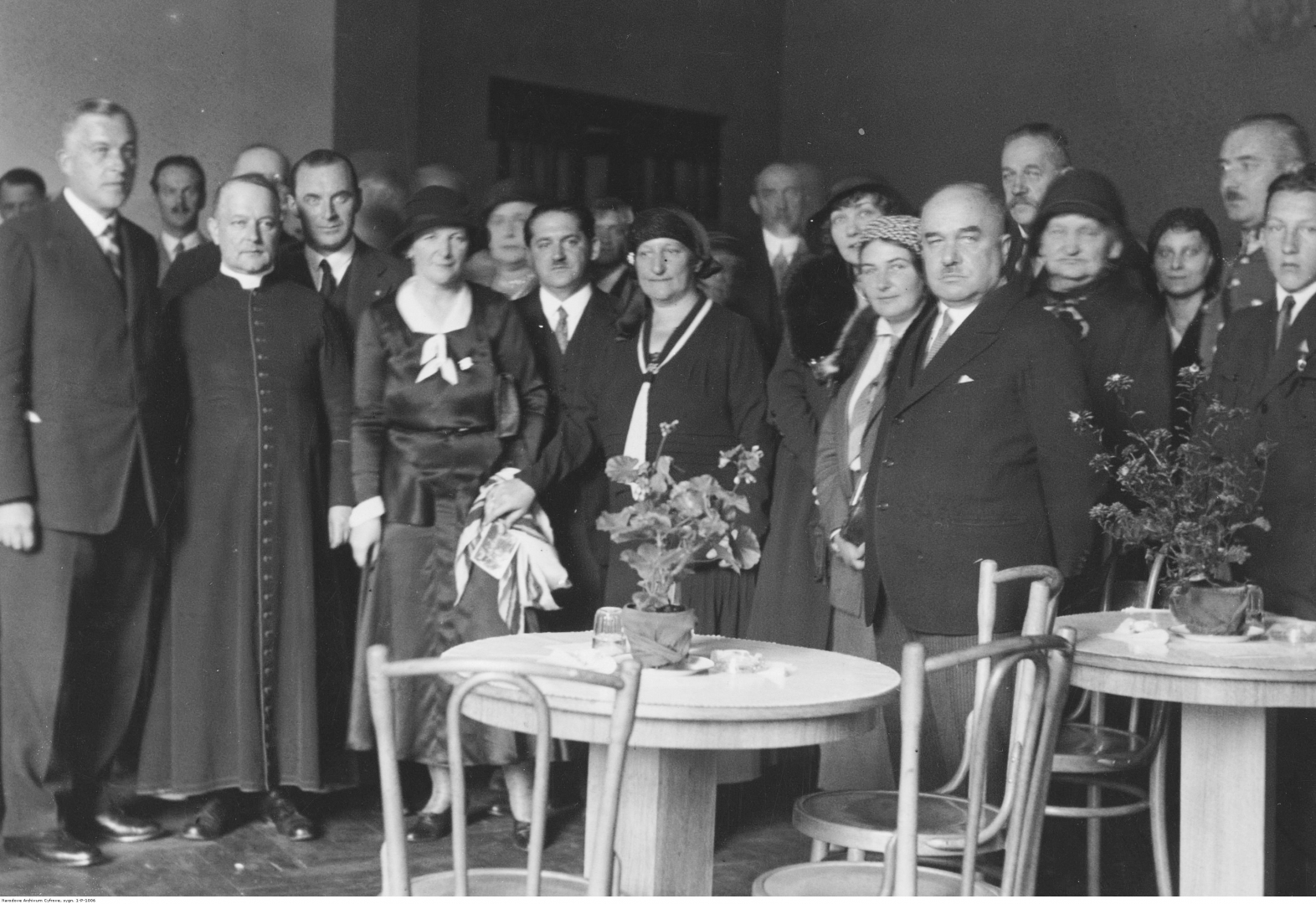 Widoczni m.in.: minister pracy i opieki społecznej gen. Stefan Hubicki (siódmy z lewej w pierwszym rzędzie), Hanna Hubicka (szósta z lewej w pierwszym rzędzie), ks. prałat Henryk Hilchen (drugi z lewej w pierwszym rzędzie), inżynier Jędrzej Moraczewski (piąty z prawej), Zofia Moraczewska (czwarta z lewej w pierwszym rzędzie), pani Heinowa (trzeci z lewej w pierwszym rzędzie) oraz komisarz rządu na miasto stołeczne Warszawę Władysław Jaroszewicz (pierwszy z lewej).