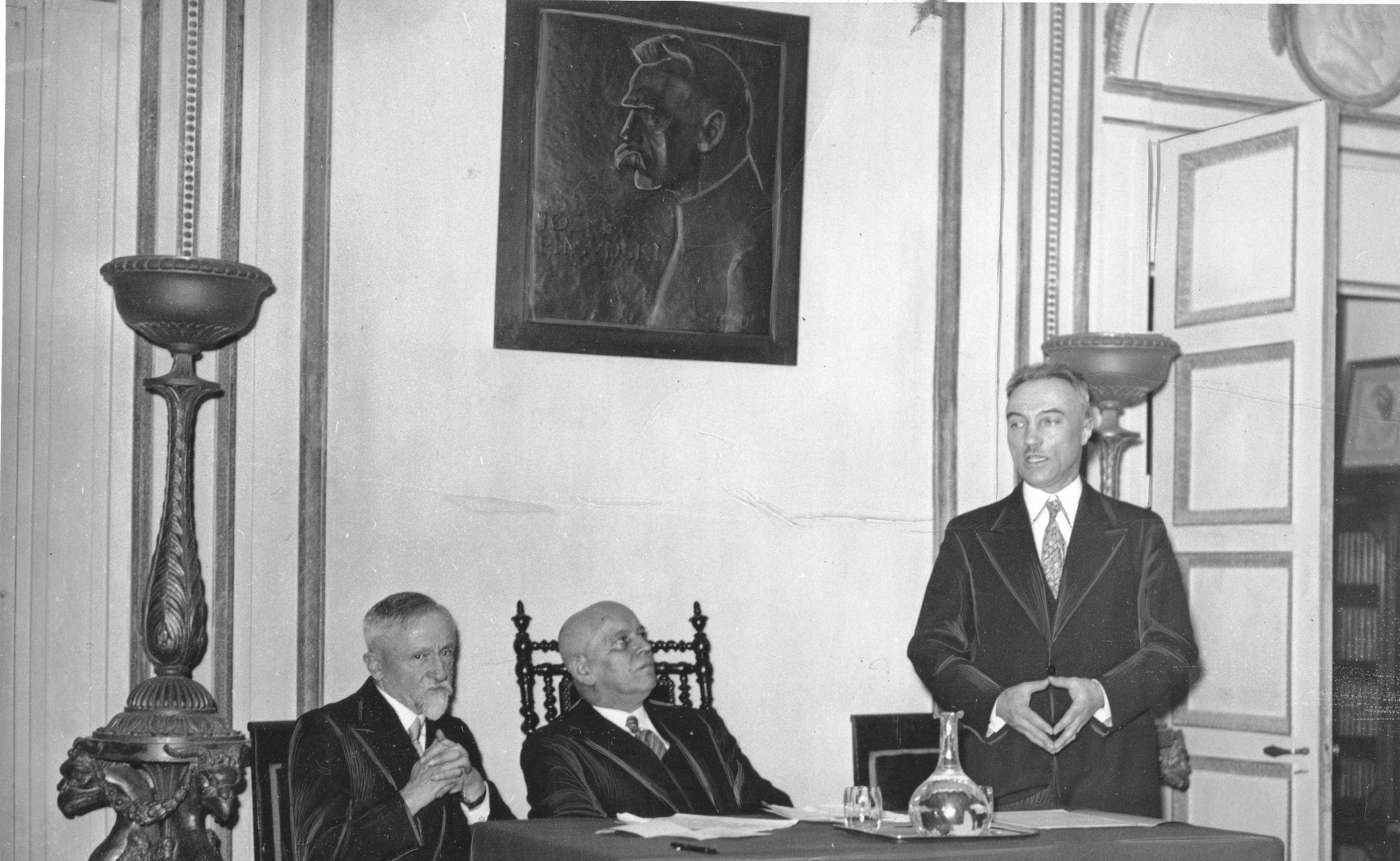 W prezydium zasiadają od lewej: delegat Ministerstwa Wyznań Religijnych i Oświecenia Publicznego Zygmunt Lubicz-Zaleski, delegat Polskiej Akademii Umiejętności Franciszek Pułaski, profesor College de France Andre Mazon (przemawia).