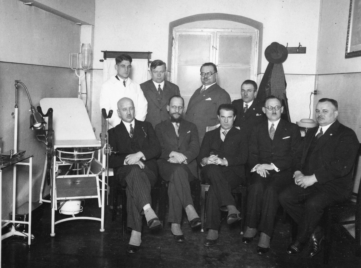 Grupa uczestników uroczystości otwarcia ośrodka zdrowia w jednym z pomieszczeń ośrodka. Siedzą od lewej: naczelnik wydziału Opieki Społecznej Urzędu Wojewódzkiego Macko, naczelnik wydziału Opieki Społecznej Urzędu Wojewódzkiego Czarnecki, naczelnik Wydziału Spraw Inwalidów Wojennych w Departamencie Opieki Społecznej Ministerstwa Pracy i Opieki Społecznej P. Rudowski, zastępca naczelnika Wydziału Zdrowia Urzędu Wojewódzkiego Morawski i poseł Jan Karkoszka. Stoją od lewej: Górzyński, wiceprezes Związku Inwalidów Wojennych RP A. Pająk, prezes Okręgowego Związku Inwalidów Wjennych w Poznaniu Ludwik Stachecki i Antoni Joachimiak.