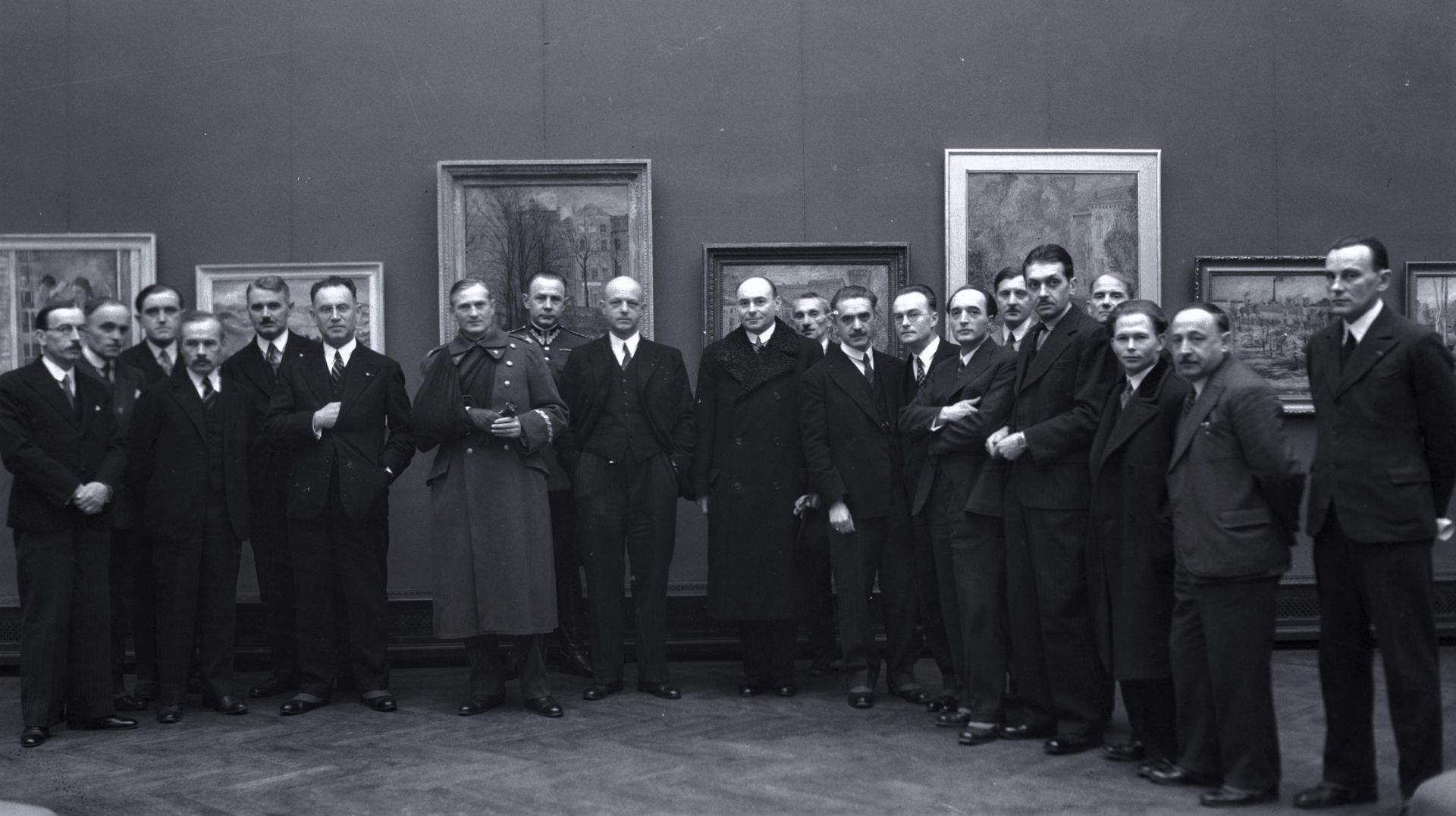 Widoczni m.in. prezydent Krakowa Mieczysław Kaplicki (6. z lewej), wicewojewoda krakowski Tadeusz Walicki (9. z lewej), generał Aleksander Narbut-Łuczyński, prof. Tadeusz Szydłowski, architekt Bogdan Treter (4. z lewej), artysta malarz Janusz Brzeski, artysta malarz Mieszko Jabłoński (13 z lewej), artysta malarz Stanisław Żurawski (z lewej), artysta malarz Roman Orszulski, sekretarz Towarzystwa Przyjaciół Sztuk Pięknych w Krakowie Artur Schroeder (2. z lewej), sekretarz Prezydium Rady Miejskiej m.Krakowa Tadeusz Piotrowski (5. z lewej).