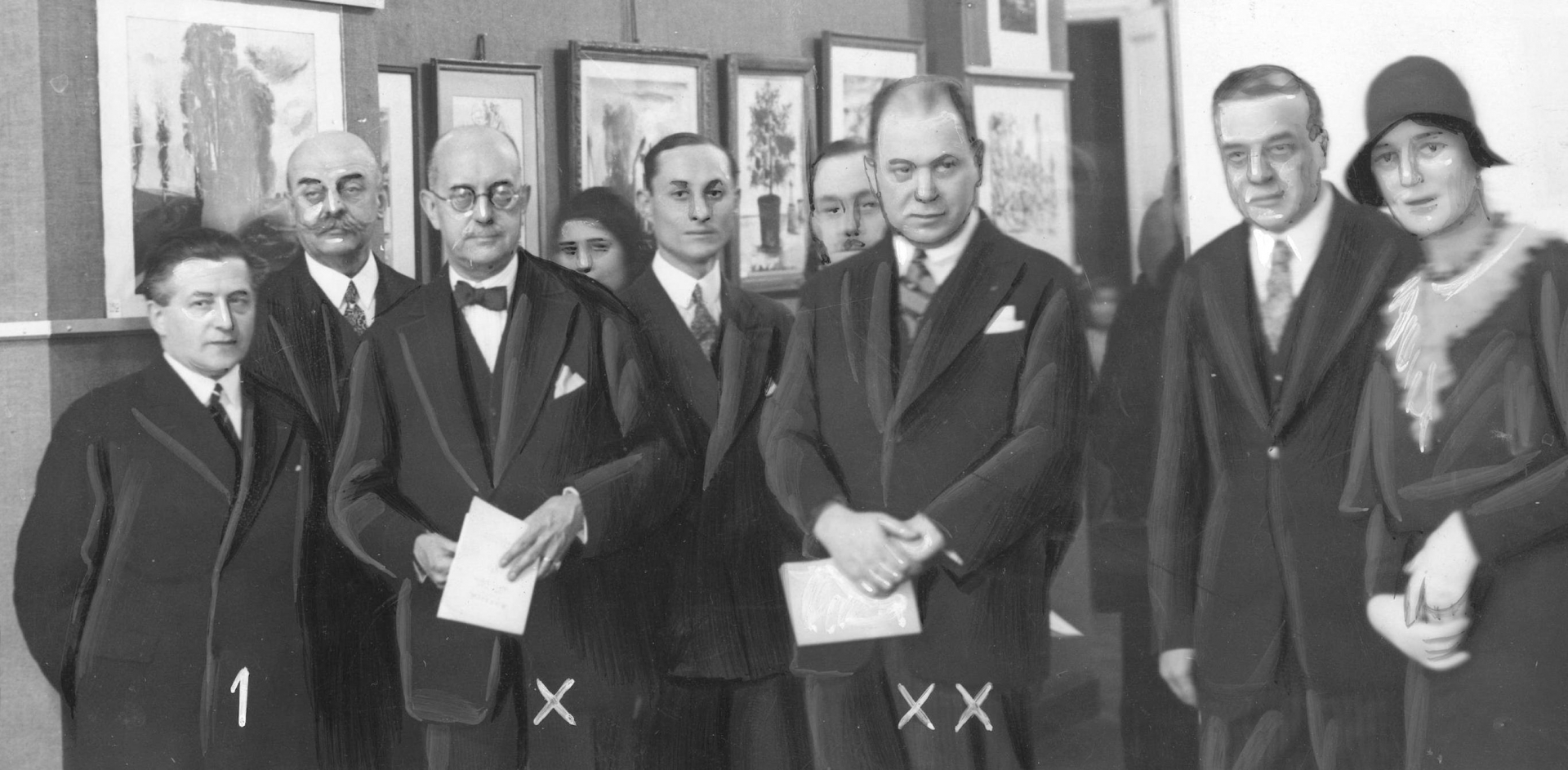 Widoczni m.in.: ambasador Francji w Polsce Jules Laroche (X), dyrektor Departamentu Nauki i Sztuki w Ministerstwie Wyznań Religijnych i Oświecenia Publicznego Władysław Skoczylas (XX), inicjator wystawy Mieczysław Sterling (1), prezes Towarzystwa Przyjaciół Sztuk Pięknych Stanisław Brzeziński (2. z lewej).