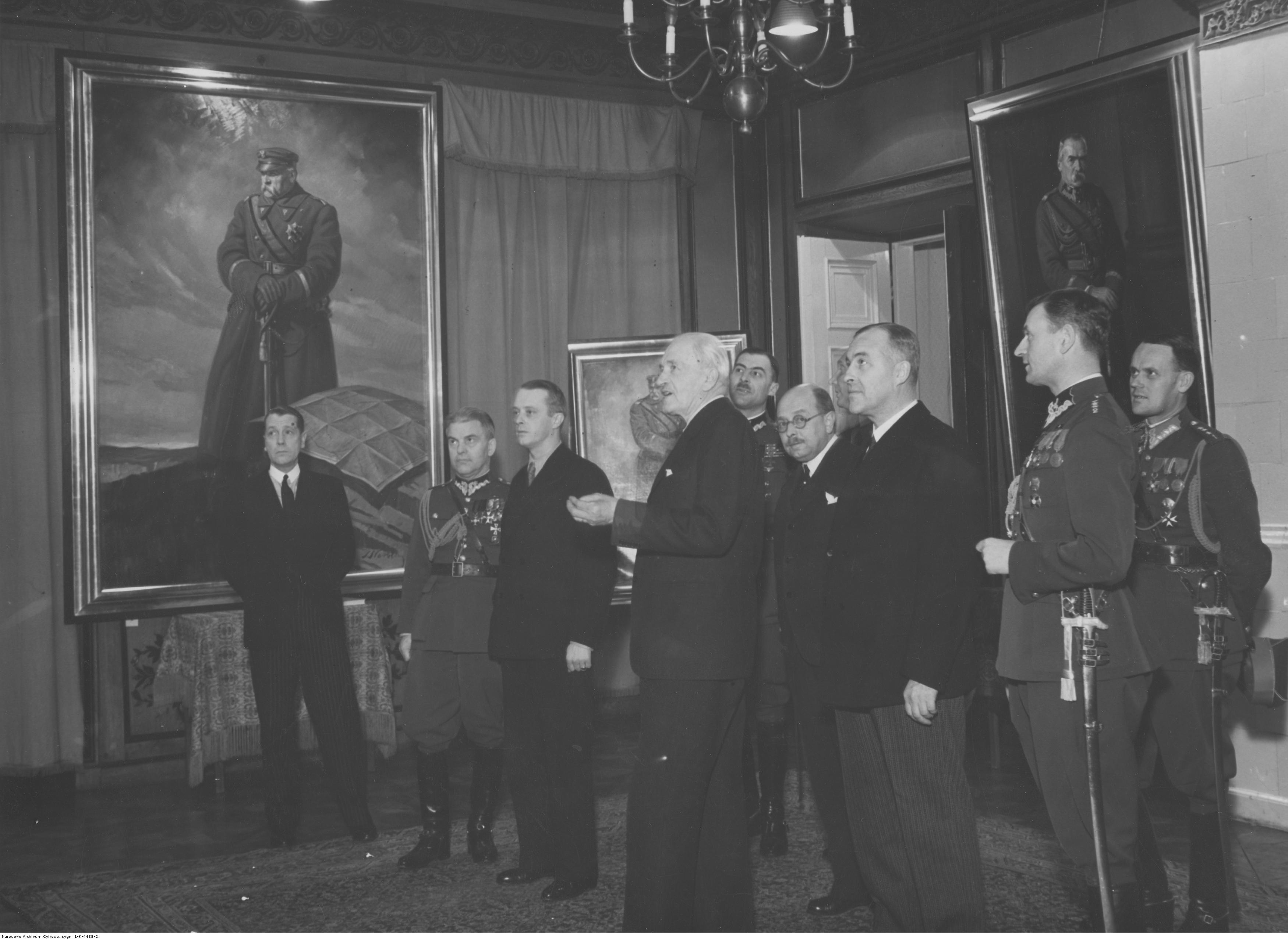 Uczestnicy otwarcia wystawy w grudniu 1935 roku w Klubie Towarzyskim. Widoczni m.in. prezydent RP Ignacy Mościcki (4. z lewej), artysta malarz Stefan Norblin (1. z lewej), minister komunikacji Juliusz Ulrych (2. z lewej), komisarz Rządu na m.st. Warszawę Władysław Jaroszewicz (3. z prawej), szef Kancelarii Cywilnej Prezydenta RP Stanisław Świeżawski (3. z lewej), szef Gabinetu Wojskowego Prezydenta RP generał Kazimierz Schally (5. z lewej), adiutant prezydenta RP kpt. Józef Hartman (2. z prawej), kpt. Jan Huber (1. z prawej).
