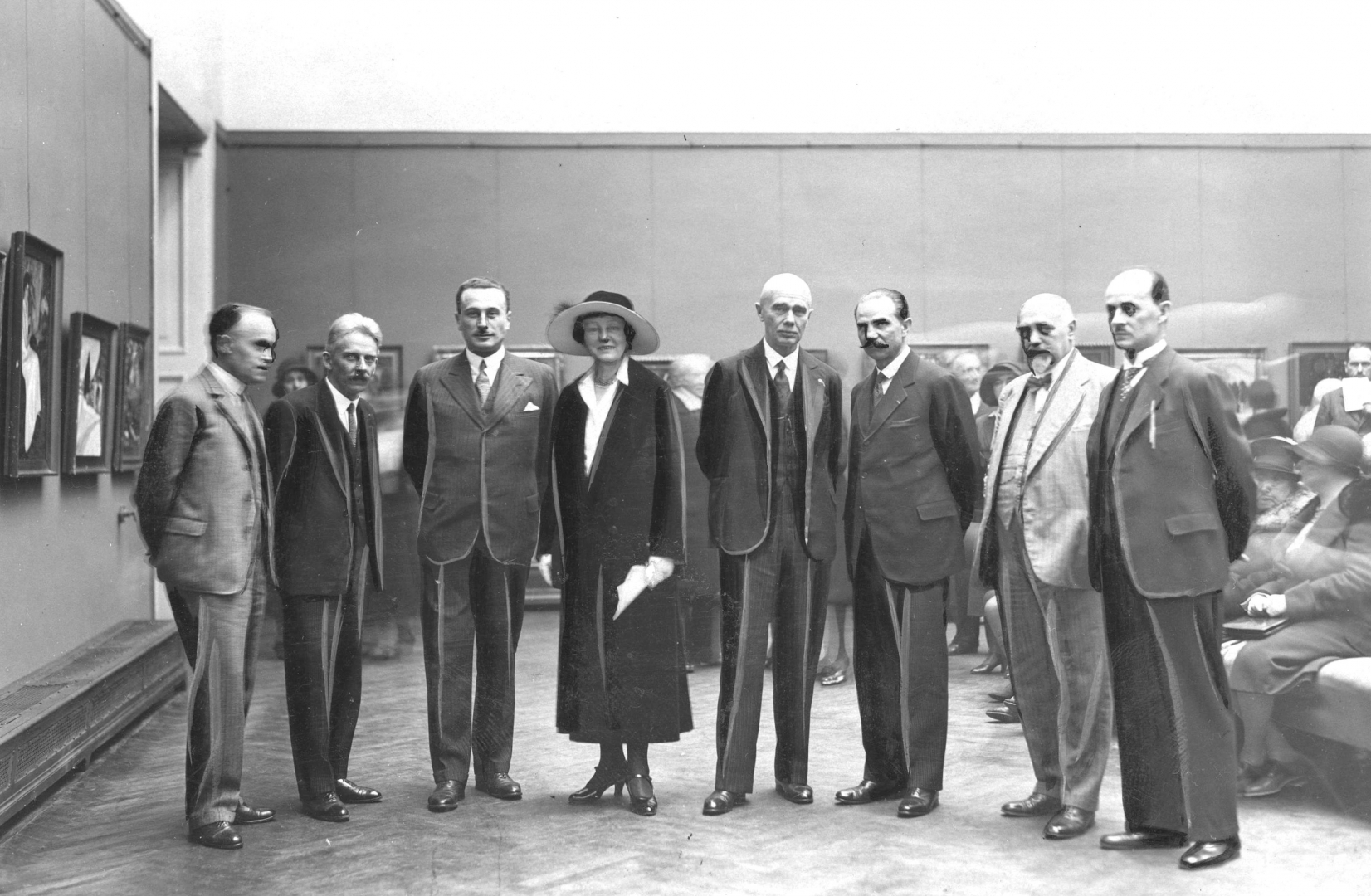 Wsród uczestników otwarcia wystawy widoczni są (od lewej): sekretarz Towarzystwa Przyjaciół Sztuk Pięknych w Krakowie Artur Schroeder, artysta malarz Andrzej Oleś, wicewojewoda krakowski Mieczysław Bilek, pani Kwaśniewska, wojewoda krakowski Mikołaj Kwaśniewski, prezydent Krakowa Władysław Belina-Prażmowski, wiceprezydent Krakowa Witold Ostrowski, wiceprezydent Krakowa Stanisław Klimecki.