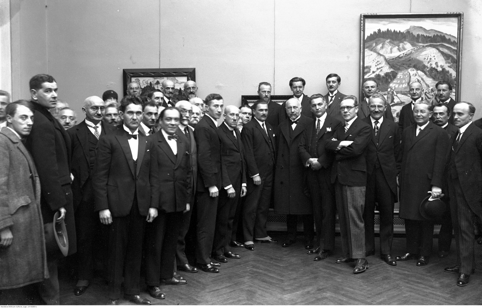 Wśród uczestników otwarcia wystawy widoczni są m.in.: prezes Towarzystwa Przyjaciół Sztuk Pięknych w Krakowie Władysław Jarocki (I. rząd 3. z prawej), konsul czechosłowacki Sedivy (I. rząd 8. z lewej), prezydent Krakowa Karol Rolle (I. rząd 9. z lewej), prezes plastyków słowackich Sivak (I. rząd 12. z lewej), prof. Władysław Semkowicz (I. rząd 7. z lewej), komisarz wystawy Palugyay (I. rząd 6. z lewej), prezes Józef Muczkowski (I. rząd 5. z lewej), poseł Marian Dąbrowski (I. rząd 2. z prawej), dyrektor TPSP Artur Schroeder (I. rząd 1. z prawej), artysta malarz Jan Rubczak (I. rząd 4. z lewej), rzeźbiarz słowacki Majersky (I. rząd 3. z lewej), wiceprezes Związku Plastyków Stanisław Popławski (ostatni rząd 6. z prawej), artysta malarz Jan Hrynkowski (ostatni rząd 4. z prawej).