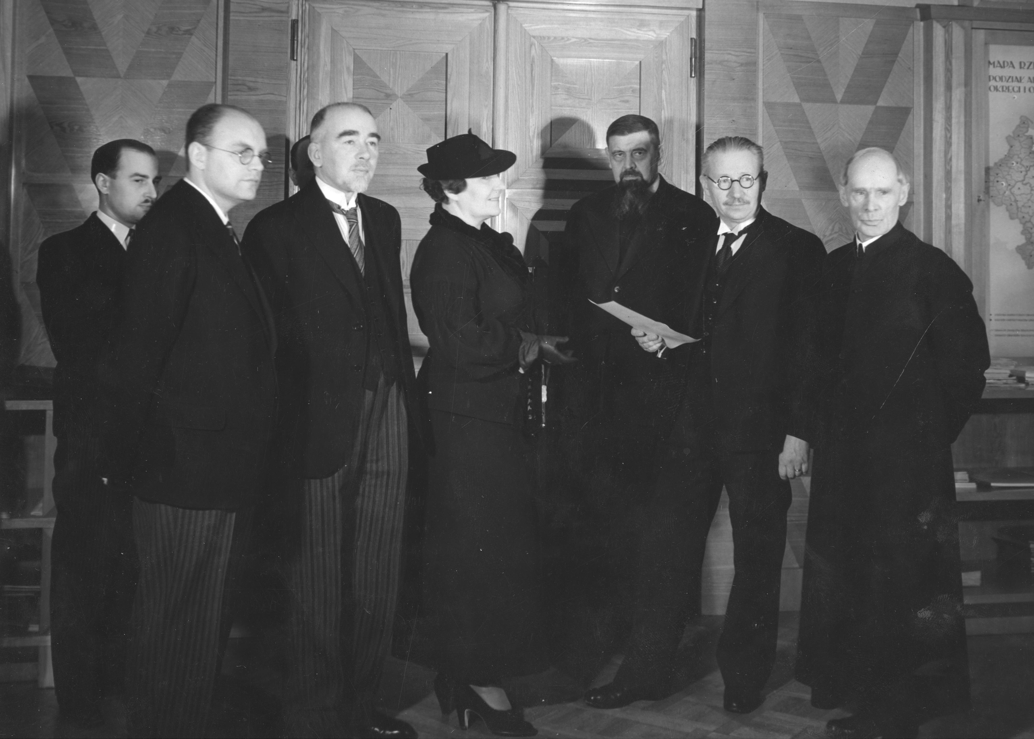 Wręczenie nagrody Zofii Nałkowskiej przez ministra Wojciecha Świętosławskiego, widoczni również: wiceminister Bronisław Żongołłowicz (pierwszy z prawej), wiceminister Konstanty Chyliński (trzeci z prawej), profesor Józef Ujejski (trzeci z lewej), Władysław Zawistowski (pierwszy z lewej), Michał Rusinek (drugi z lewej).