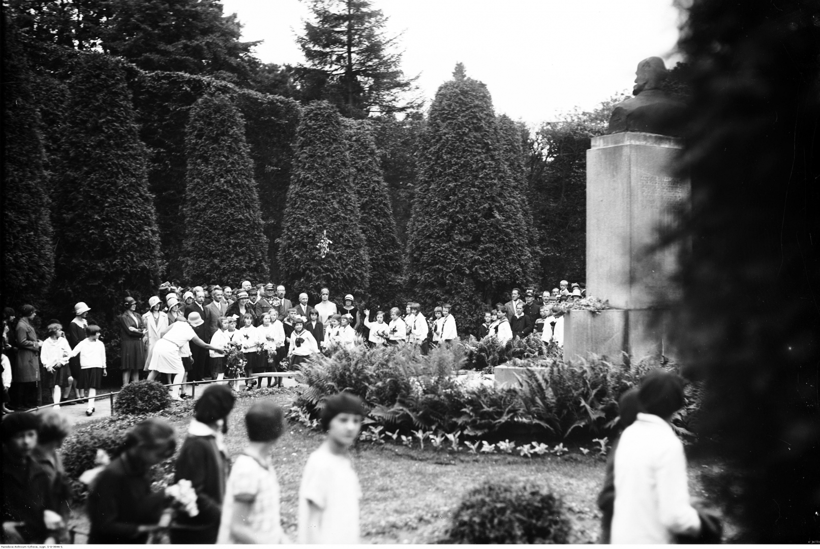 Grupa dorosłych i dzieci przed pomnikiem Henryka Jordana.